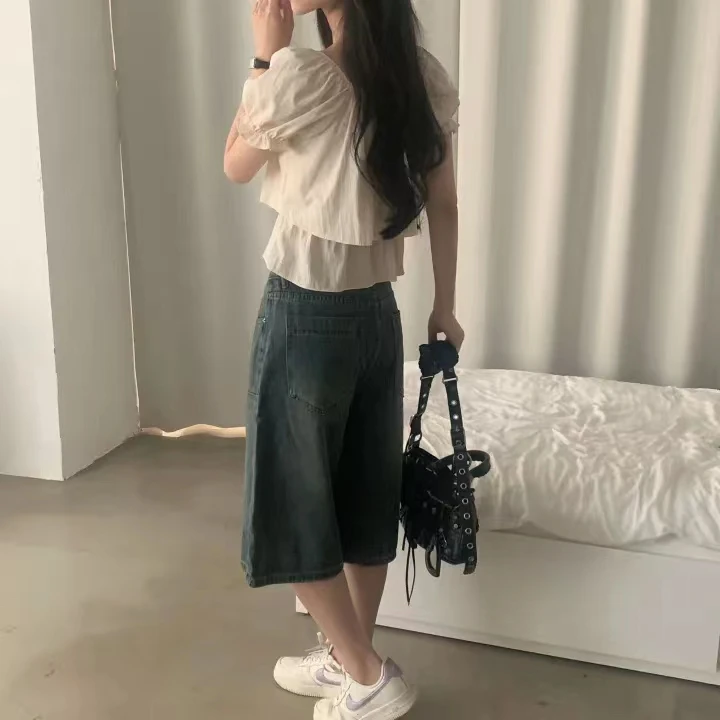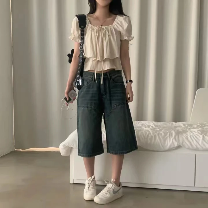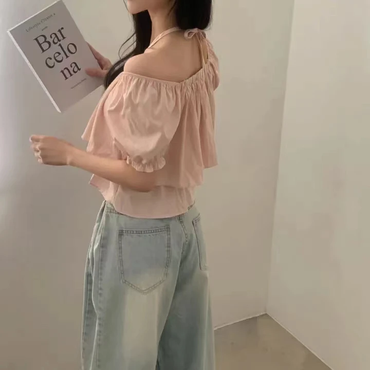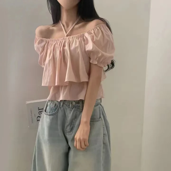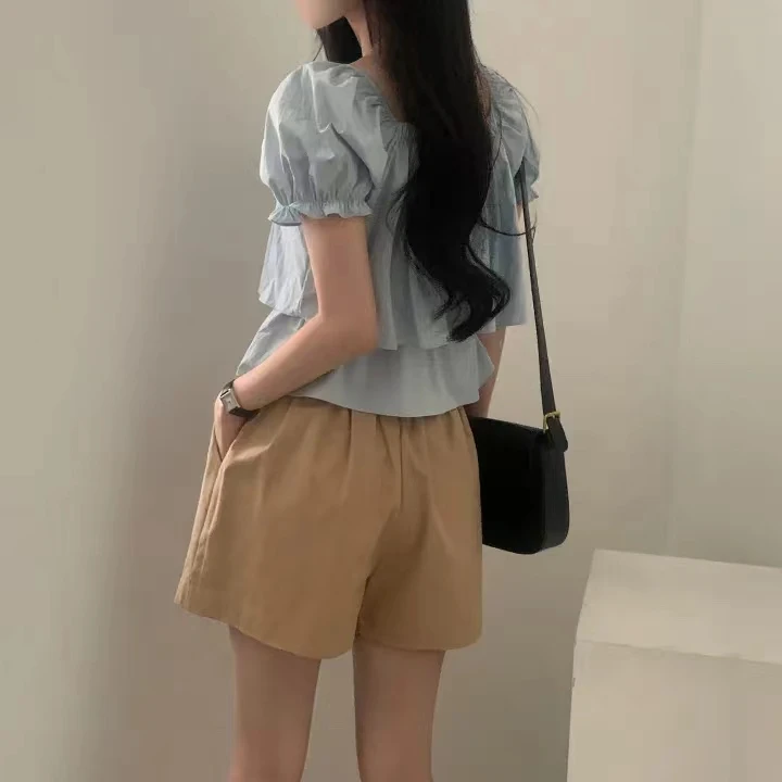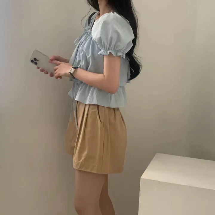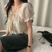 Bxoxo Summer New Sle Double Layered Chiffon irt with Bow Tie Bubble Sve Square Collar ort Sve Women's Faion Top