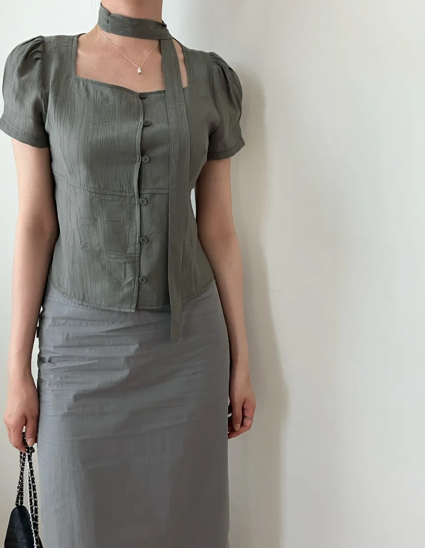Stand out with its distinctive square collar and bubble sleeves, offering a unique blend of classic and contemporary design.