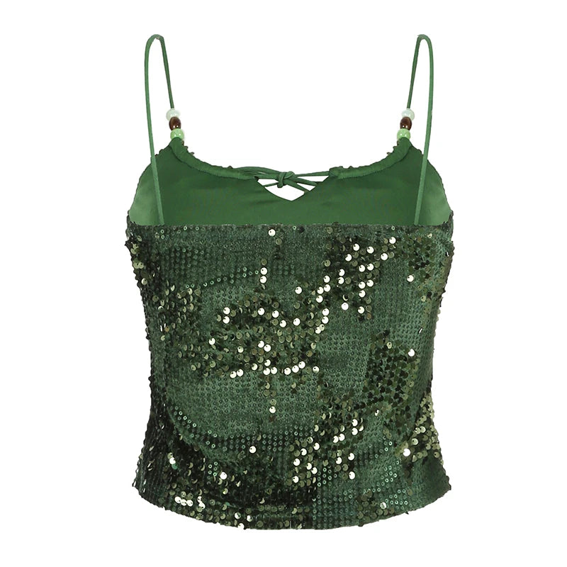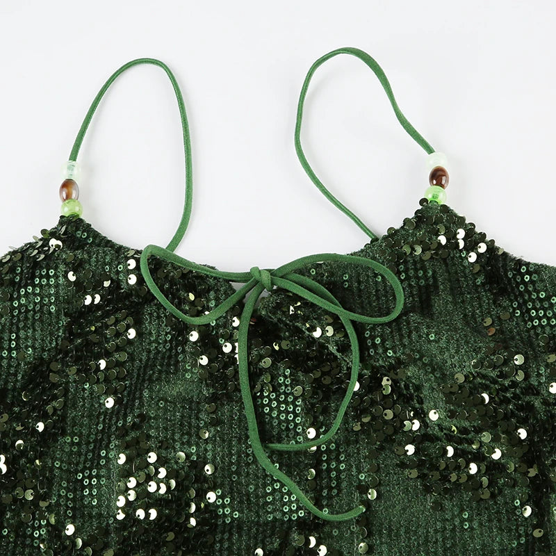 BXOXO Summer Party Sequin Camis y2k Retro Green Sleeveless Lace-up Skinny Crop Top for Women Vintage 2000s Strap Tees Aesthetic