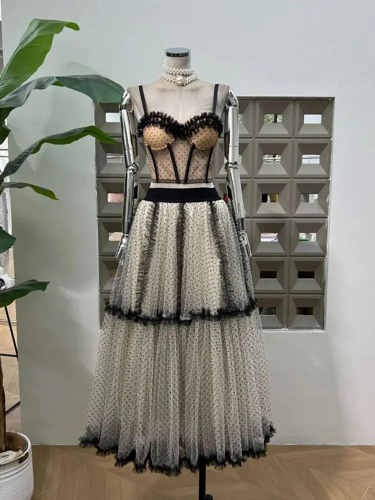 BXOXO Summer Polka Dot Tight Top Mesh Women's Elegant Underwear Y2K Fashion Sexy Set Party Evening Dresses Two Piece Set Long Skirt