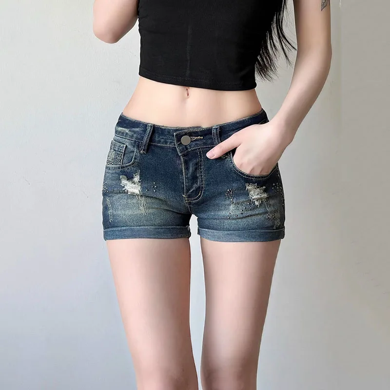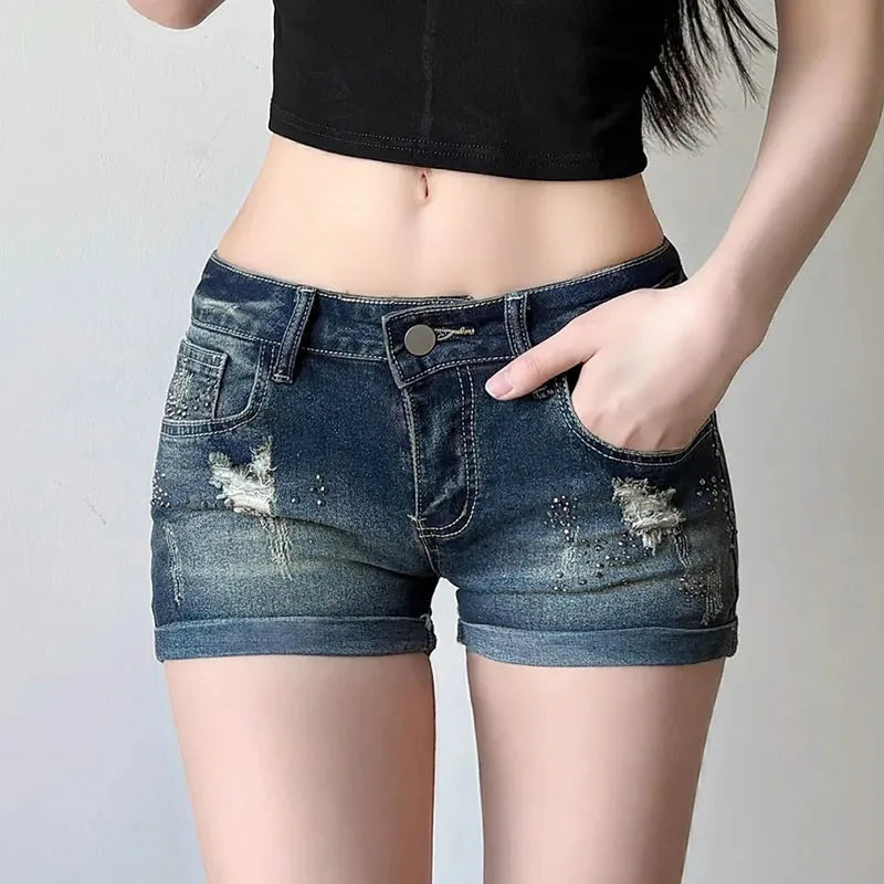 Bxoxo Summer Women Hole Denim Shorts Y2K Sexy Low Waist Slim Hot Rhinestones Short Jeans Women Retro Streetwear Roll Up Hem Shorts