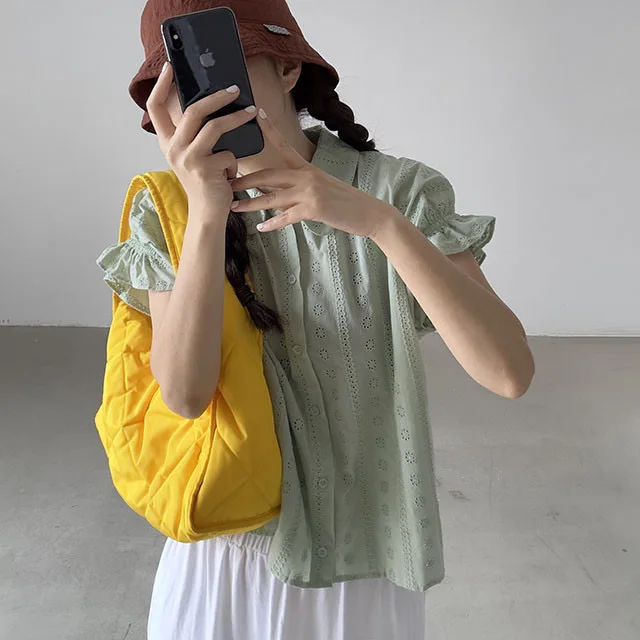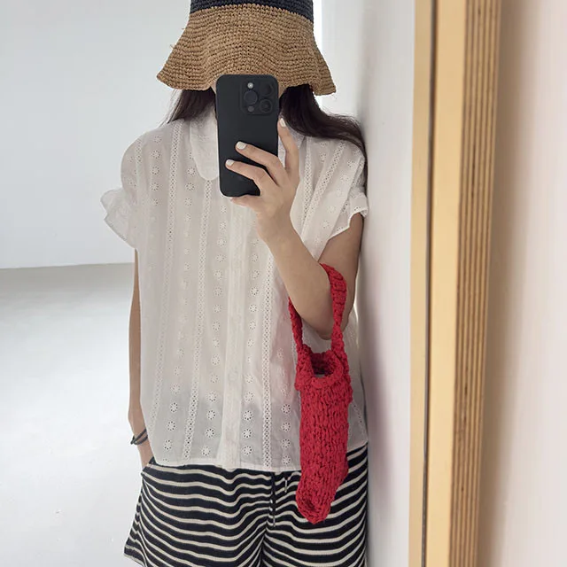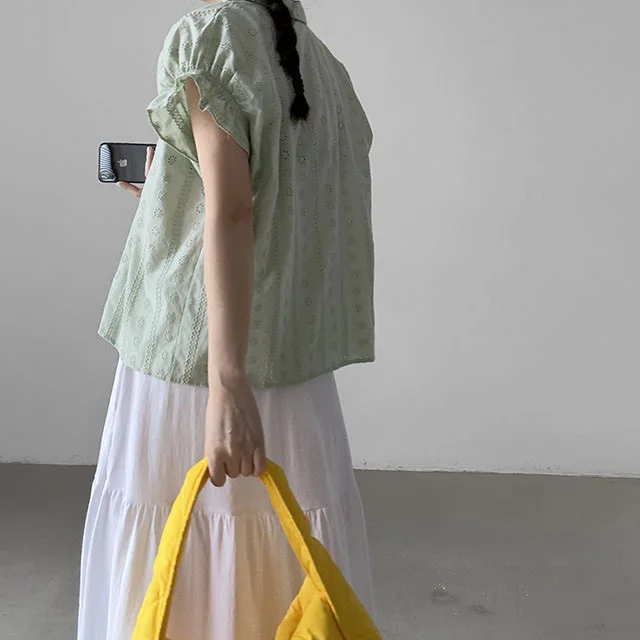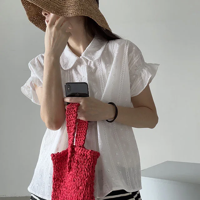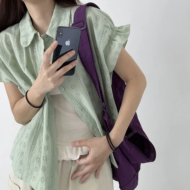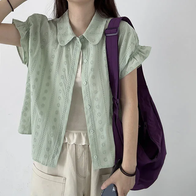 The sweet French style collar adds a touch of elegance, making this shirt suitable for both daytime and evening wear.