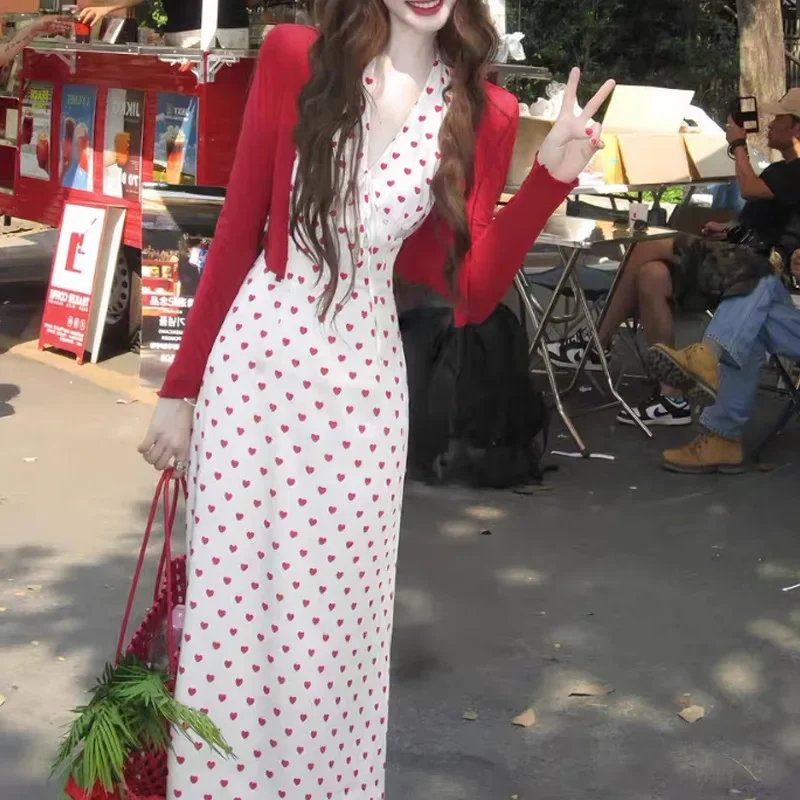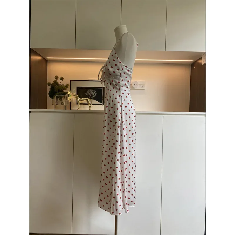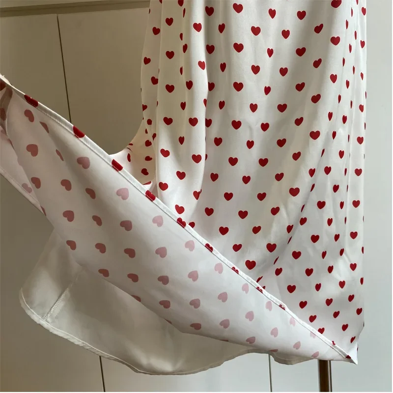 Bxoxo Sweet French Style Heart Print Satin Dress Neck Hanging Women's Maxi Skirt V-neck Sleeveless Empire Waist Spring Summer New