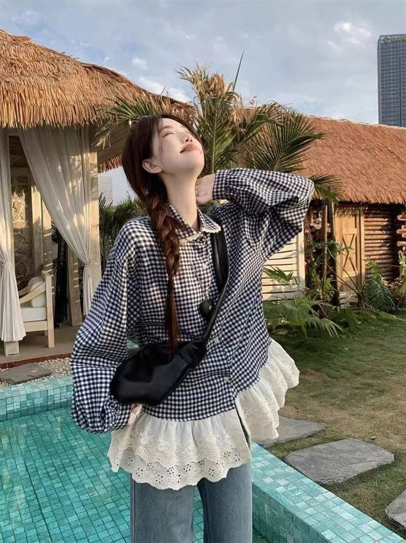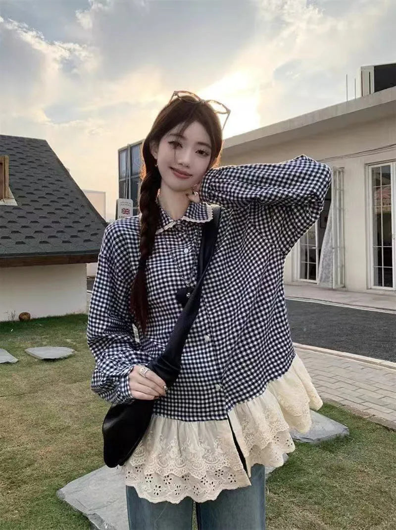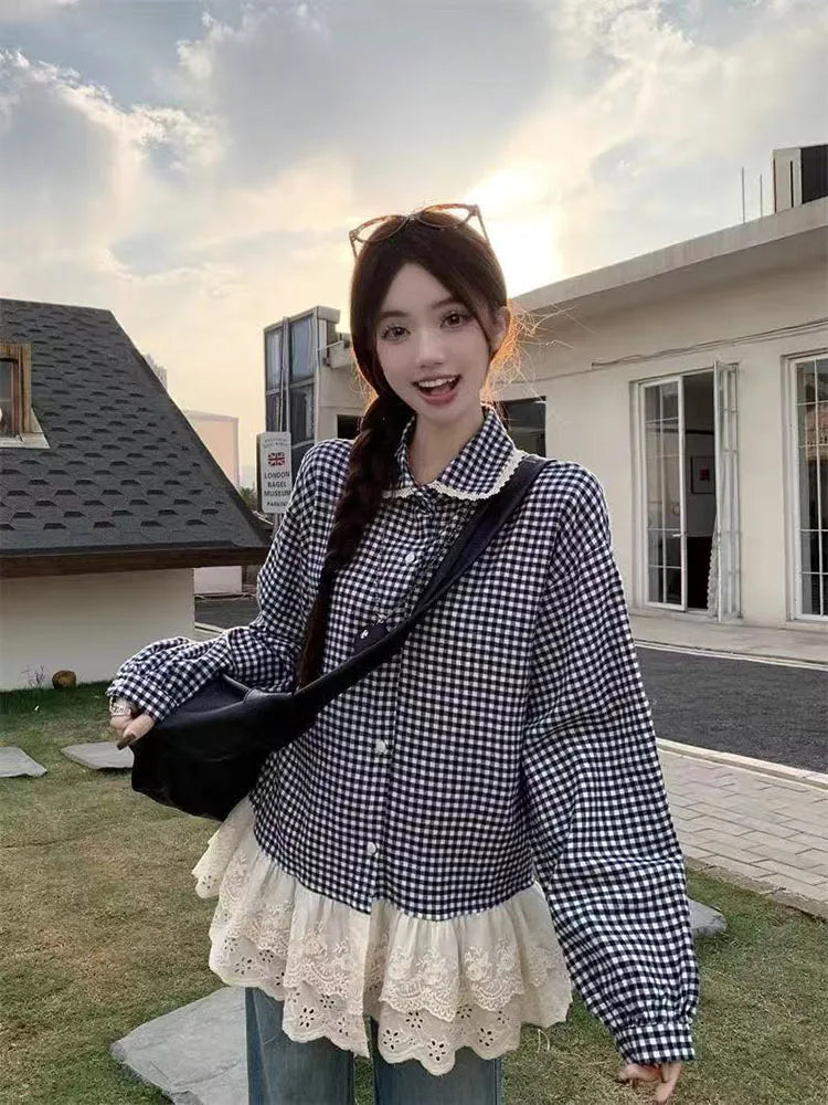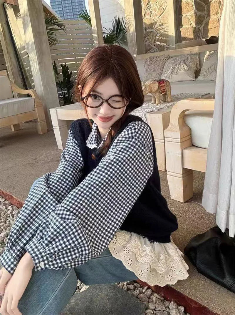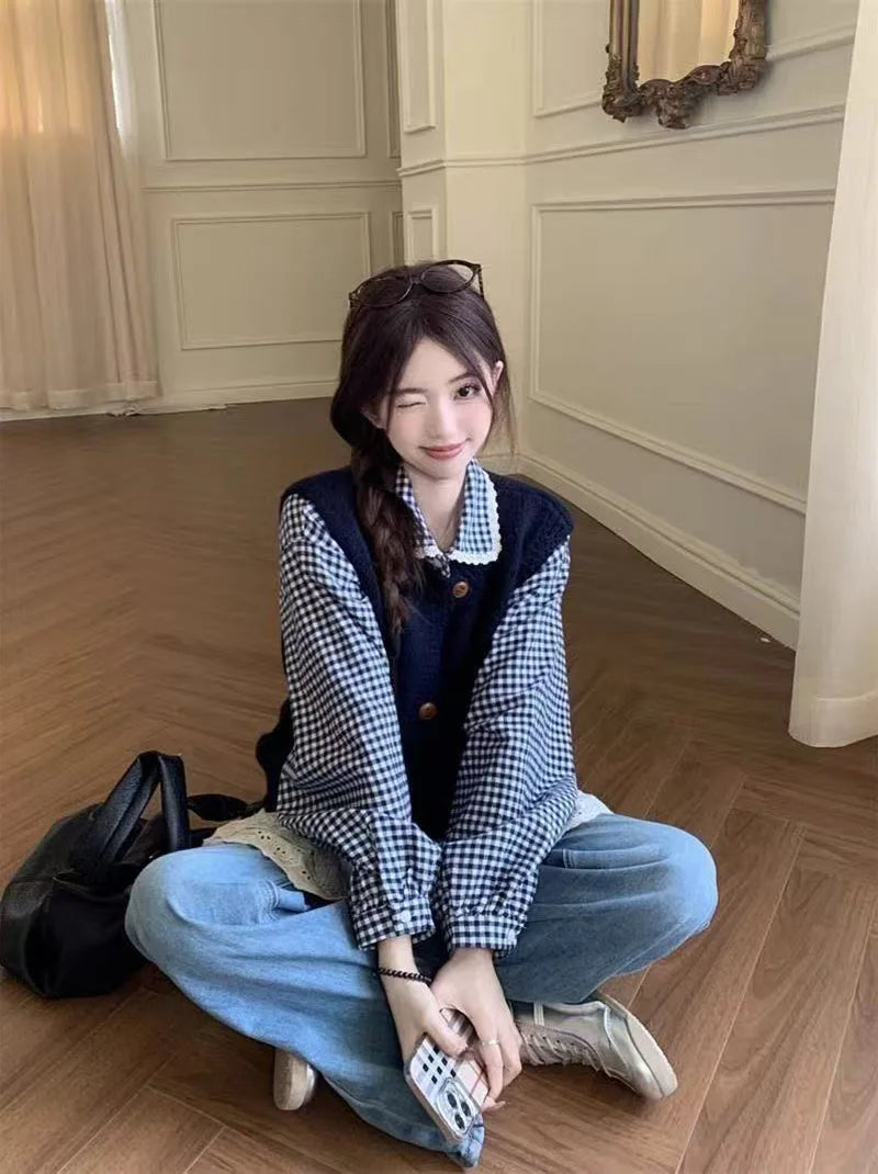 Bxoxo Sweet Knitted Cardigan Vest 2 Piece Sets Women Korean Chic Plaid Shirt Long Sleeve Tops Y2K Fashion Preppy All Match Tanks Suit