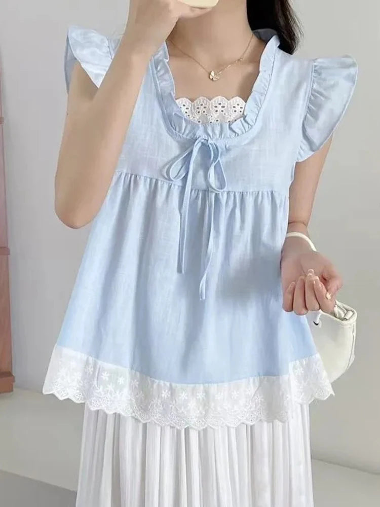 BXOXO Sweet Lace Patchwork Tanks Women Loose Flying Sleeve Elegant Tanks Tops Vintage Casual Female Korean Summer Retro Tops New