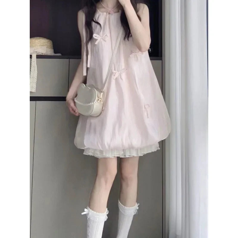 Bxoxo Sweet Pink Butterfly Knot Flower Bud Dress Women's Loose Slimming Short Skirt Summer New Style Student Mini Dress Casual Chic
