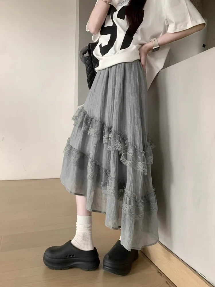 BXOXO Sweet Skirts Women Lace Patchwork Irregular Summer Fashion 2025 Solid Elegant Stretch High Waist Loose Long Skirt