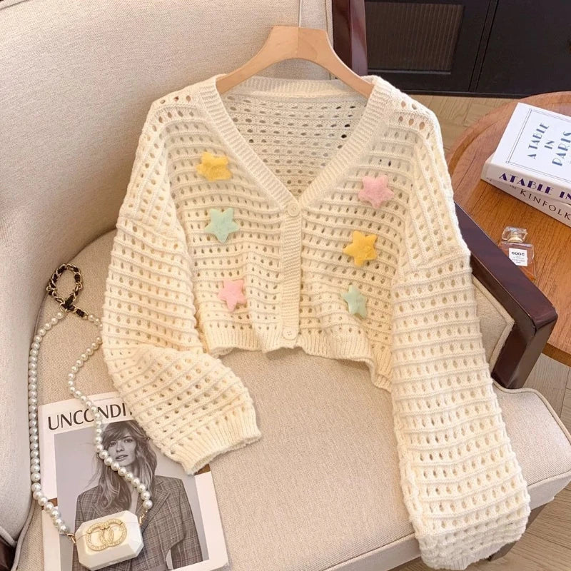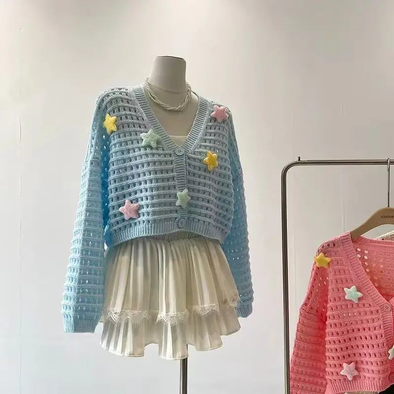 Bxoxo Sweet Star Hollow Out Knitted Cardigans Women Kawaii Y2k Pink Crop Tops Elegant Casual Cutecore Long Sleeve Cardigans