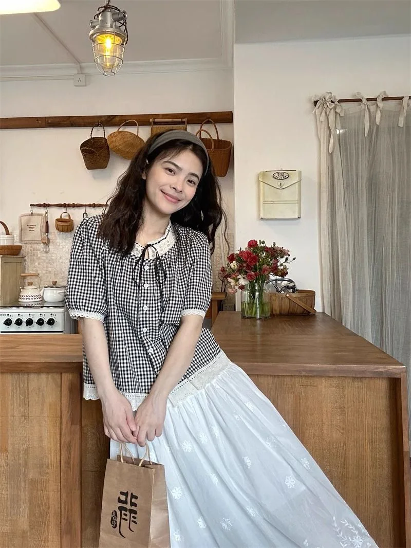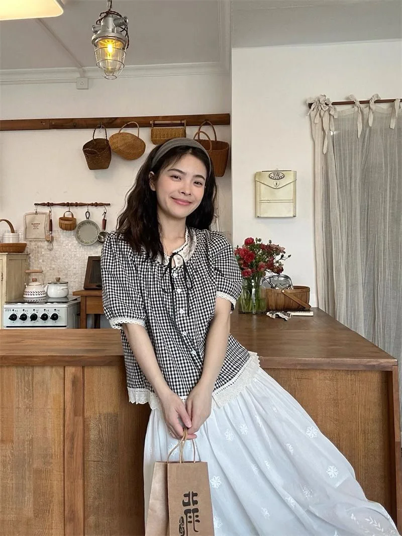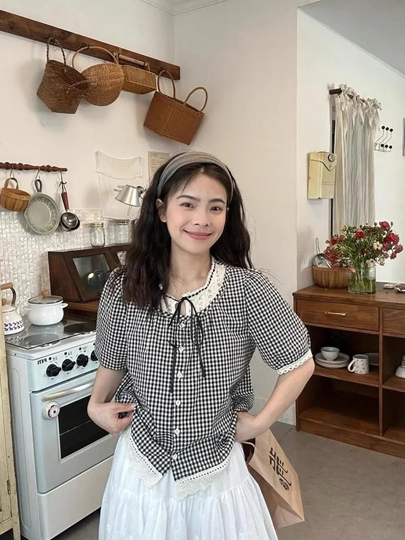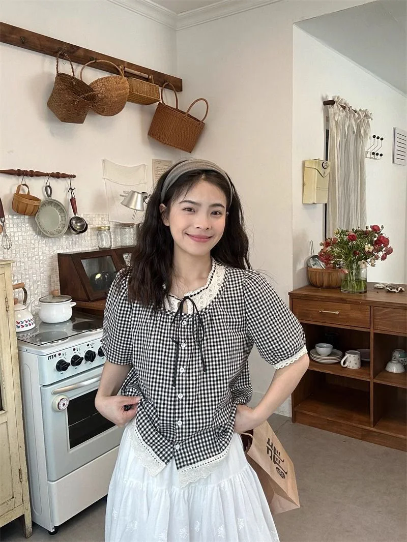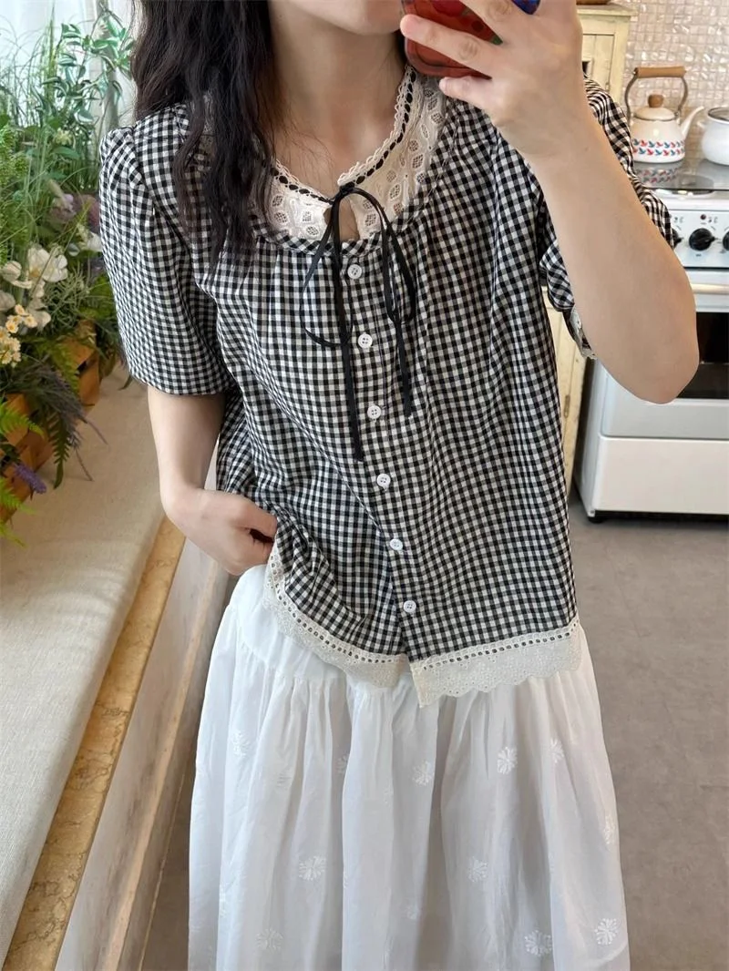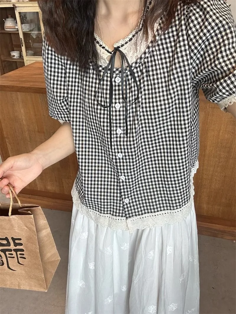 BXOXO Sweet Vintage Women Plaid Blouse Casual Preppy Style Lace Patchwork Loose Shirt Cute Retro Female Short Sleeve Lace Up Tops
