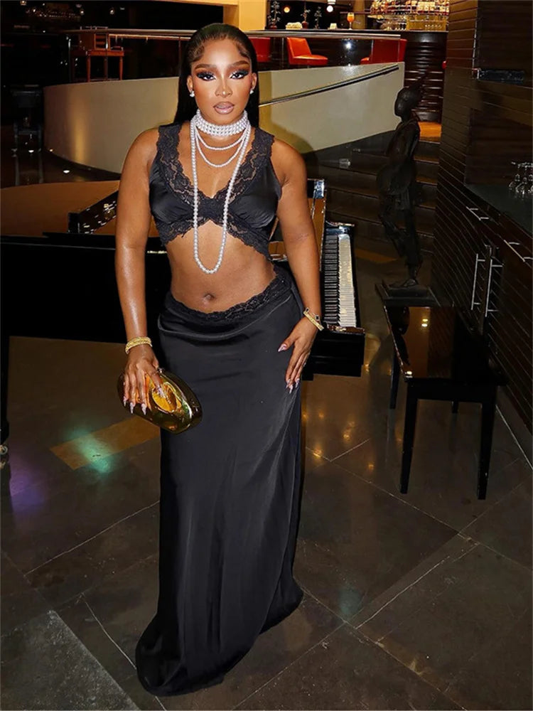 BXOXO v-Neck Summer Women 2 Piece Set Sexy Skinny Lace Patchwork Tank Tops+Long Skirts Stretch Clubwear Midnight Party Suit