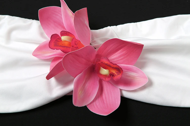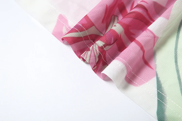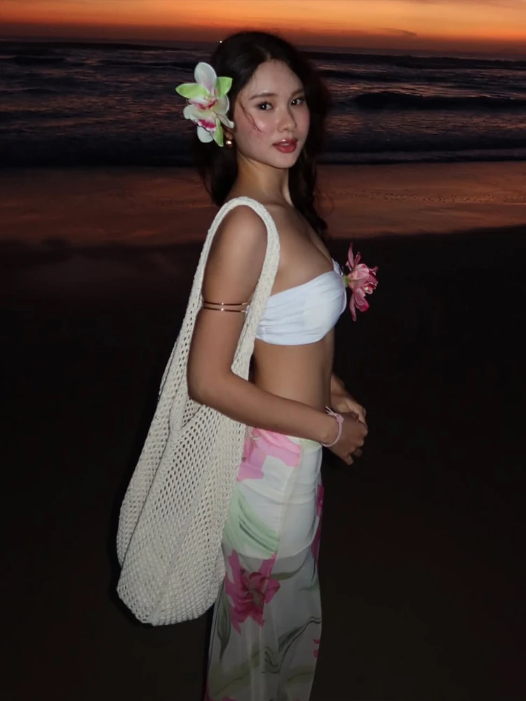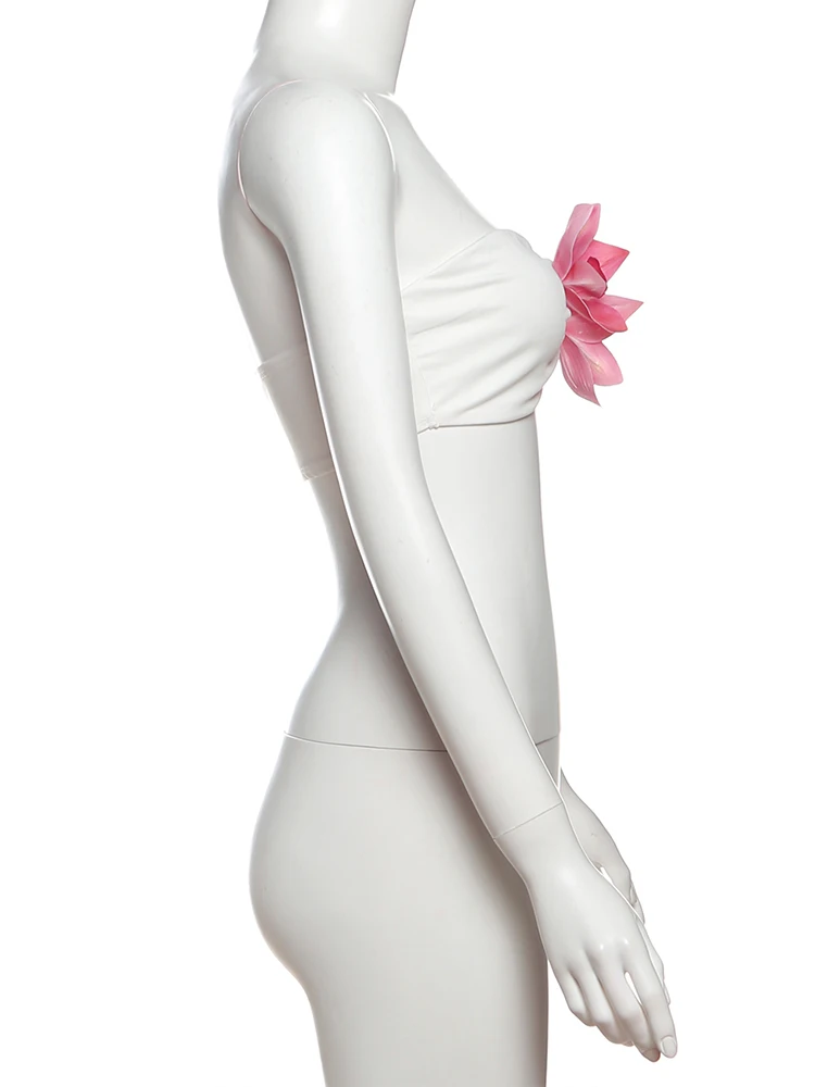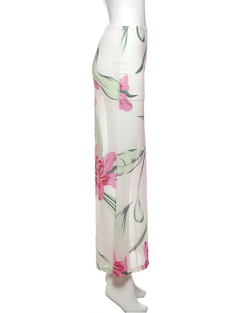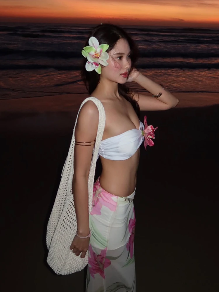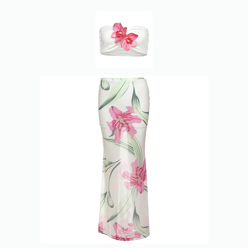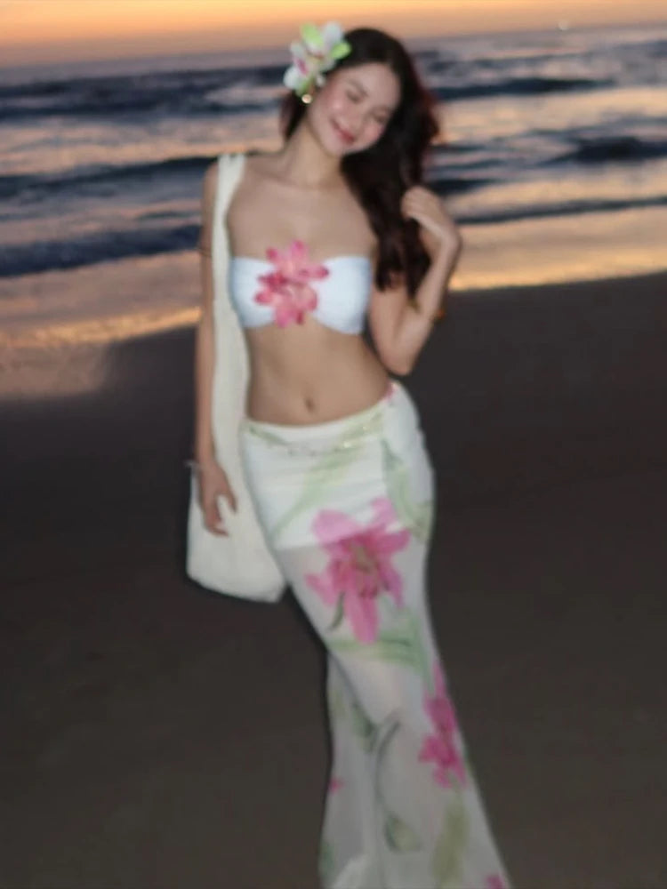 BXOXO Vacation Pretty Women Two-Piece Set 3d Flowers Bandeau Mini Top+See Through Print Bottoms Beach Party Matching Suits