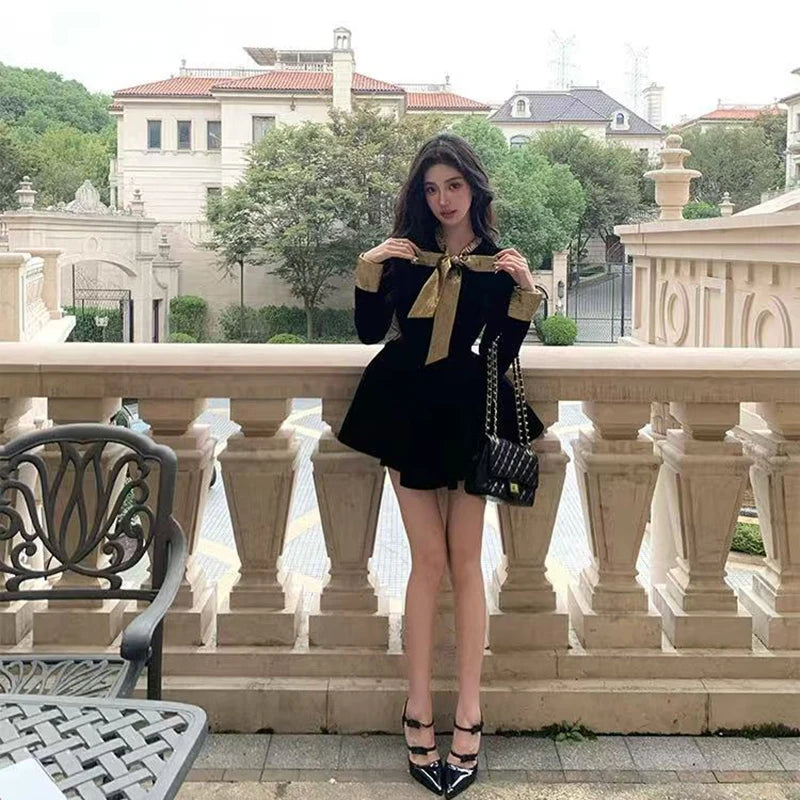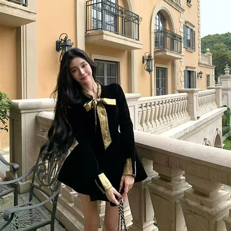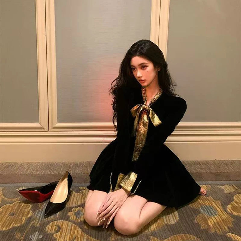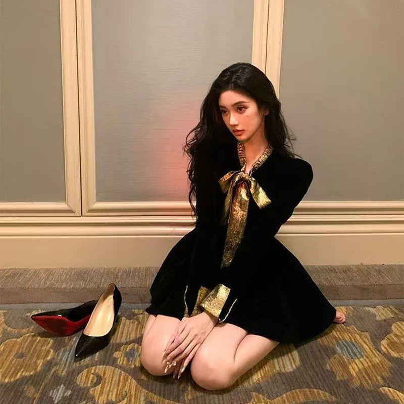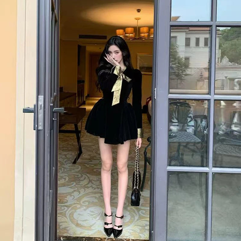 Bxoxo Velvet Lace Up Mini Dress Autumn Korean Chic Bow Patchwork Mini Dress Fashion Aesthetic Streetwear Party Club Ladies Vestidos