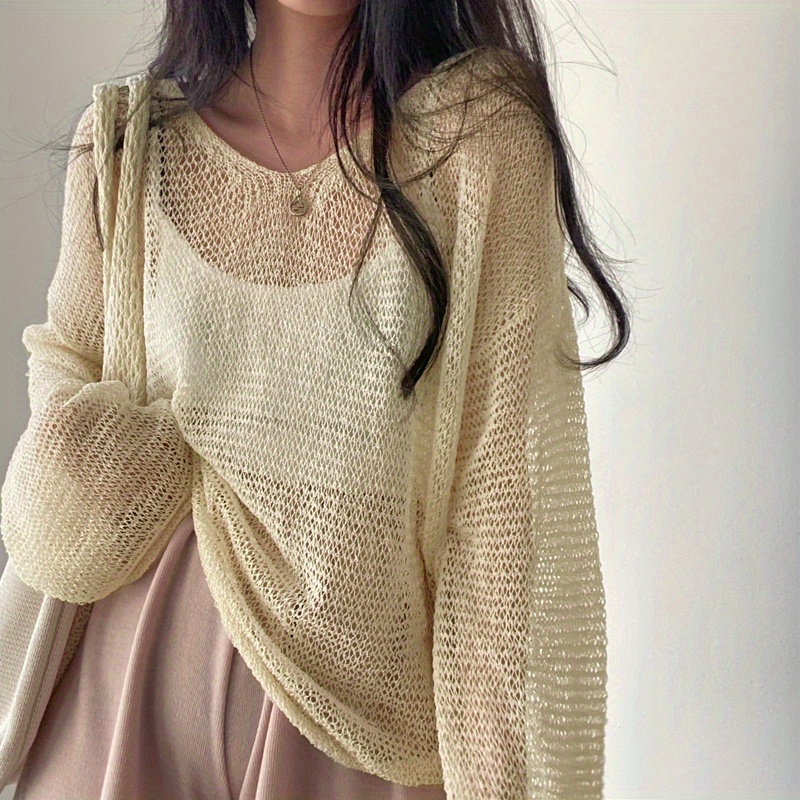BXOXO Vibrant Solid Knitted V-Neck Pullover Top - Soft Micro Elasticity, Semi-Sheer, Elegant Long Sleeve Crochet Coverup - All Seasons, No Printing, Polyester Fabric, Knit Construction, Womens Casual Clothing