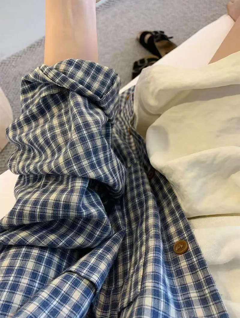 Bxoxo Vintage Blue Plaid Shirts for Women Casual Loose Long Sleeve Checkered Blouses Bf Summer Streetwear Lapel Shirt New