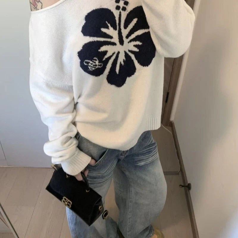 Bxoxo Vintage Elegant Off Shoulder Sweater Women Sexy White Knitwear Long Sleeve Jumper Slash Neck Loose Harajuku Pullovers