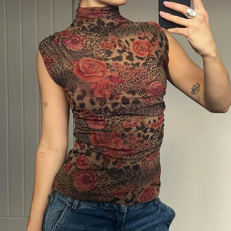 BXOXO Vintage Floral Print Crop Top Women Retro Sleeveless Turtleneck Skinny Tank Tops Harajuku y2k Tee Summer Casual Lady Vest