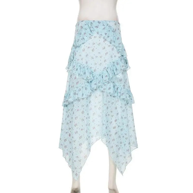 Bxoxo Vintage Floral Skirt Women Boho Mesh Y2k Ruffle Skirts Irregular Summer Fashion Layered Vacation Long Skirts Streetwear