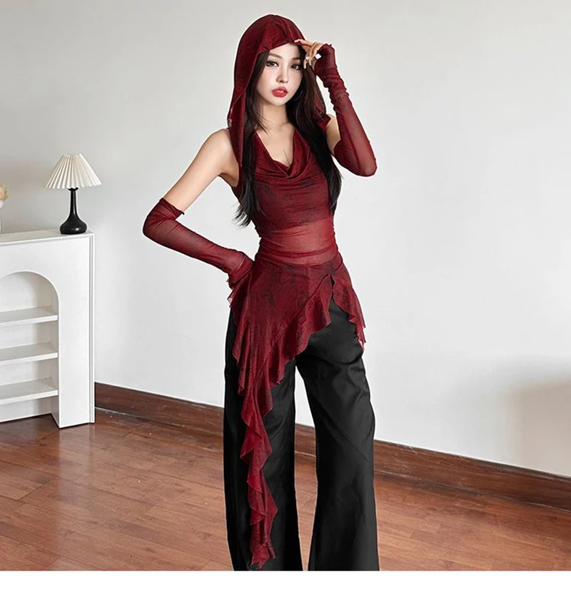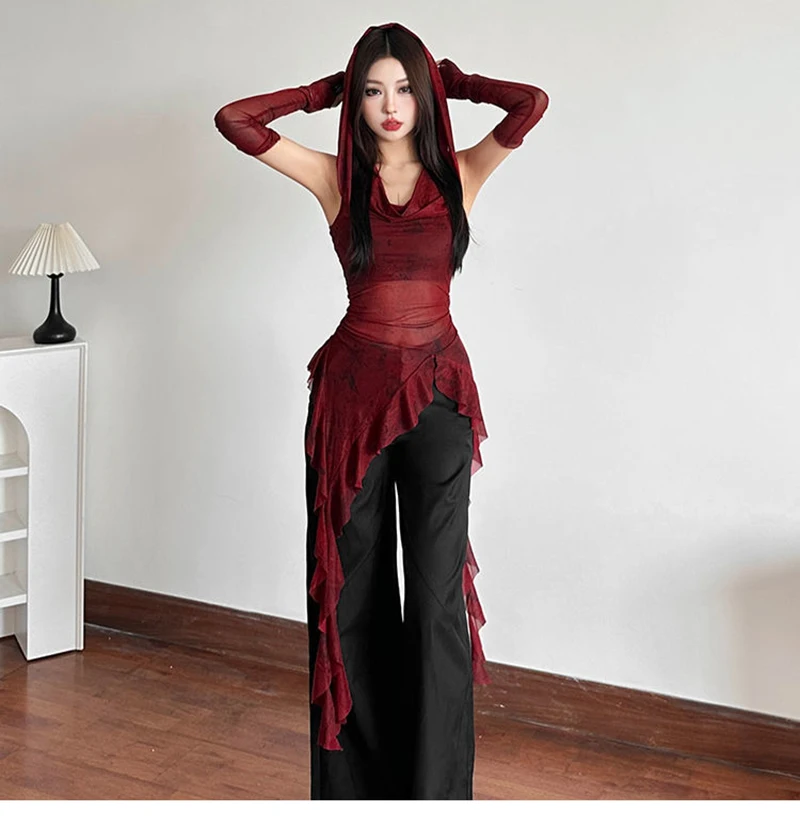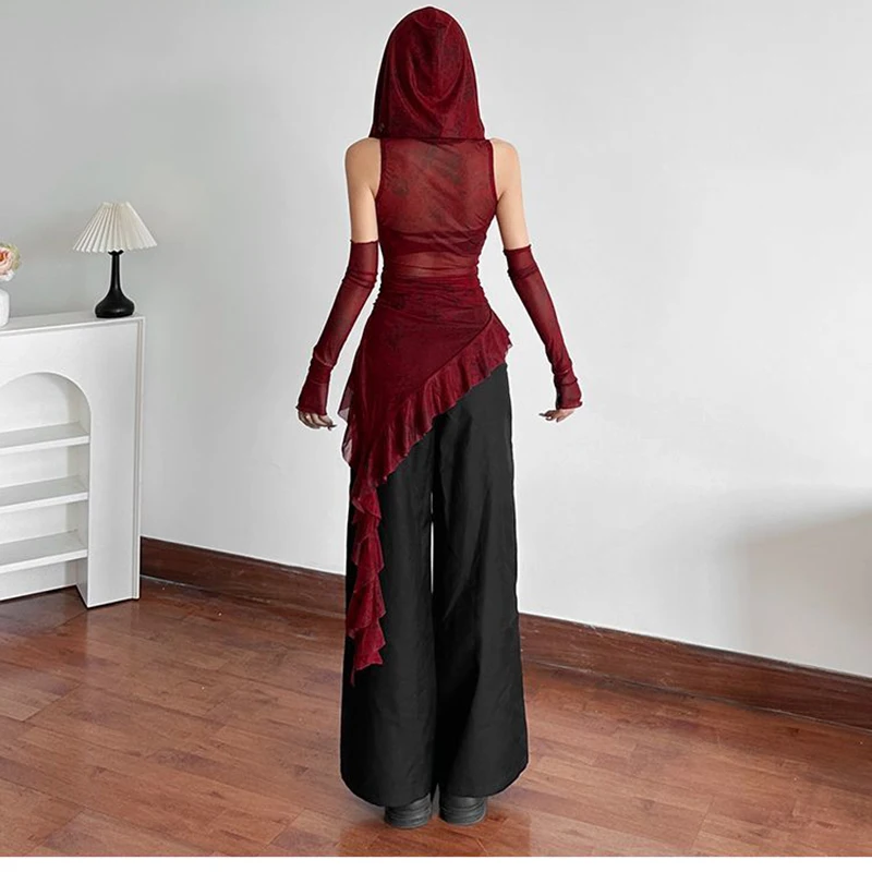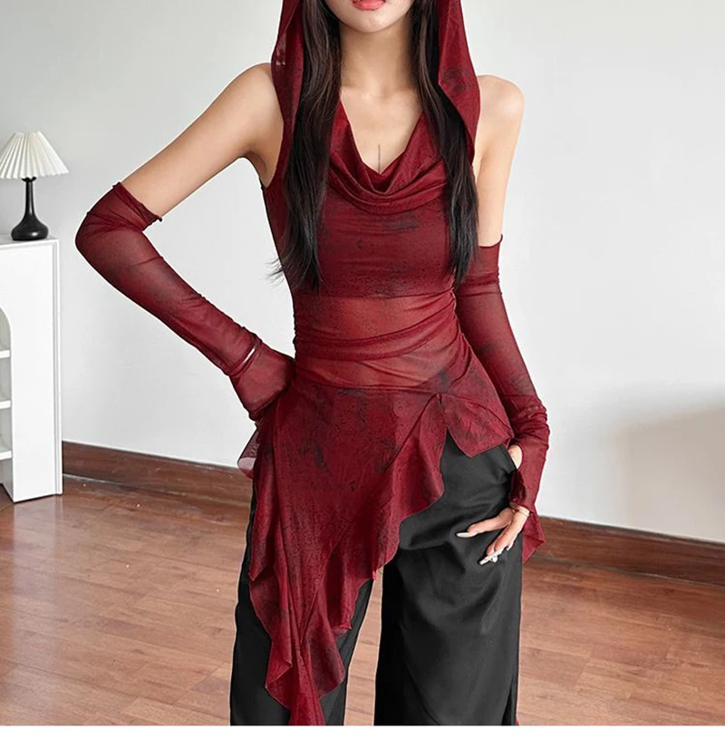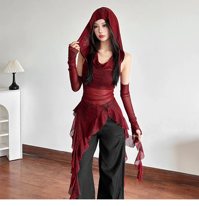 BXOXO Vintage Gothic Hooded T Shirts Women Sexy See Through Slim Y2K Tees Streetwear Harajuku with Sleeves Female Irregular Tops