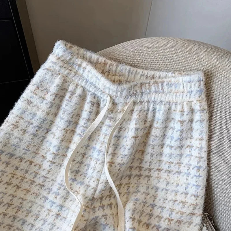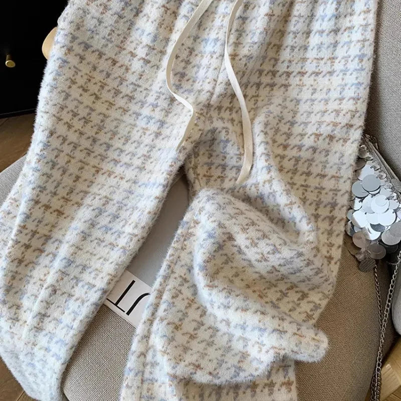 Bxoxo Vintage Houndstooth Women Wide Leg Pants Winter Thick Faux Mink Velvet Loose Straight Trouser High Waist All Match Female Pants