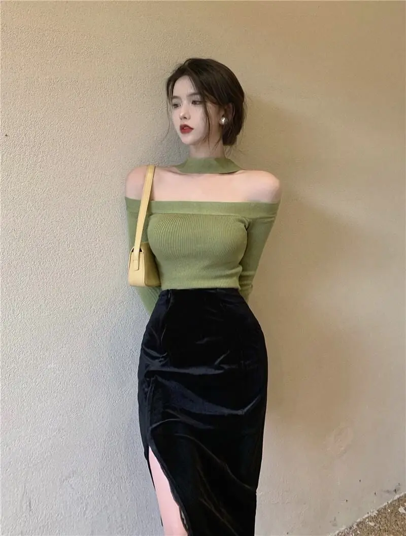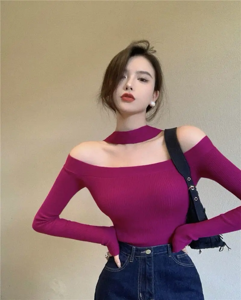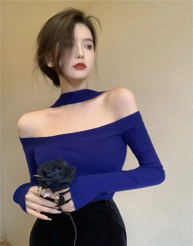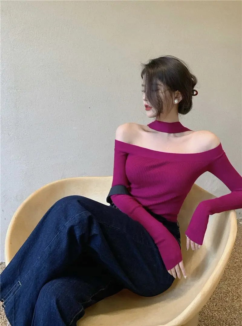 Bxoxo Vintage Knitting Short Tops Tees Spring Autumn New Long Sleeve Slash Neck Solid Slim Bottoming Shirt Sexy Fashion Women Clothing