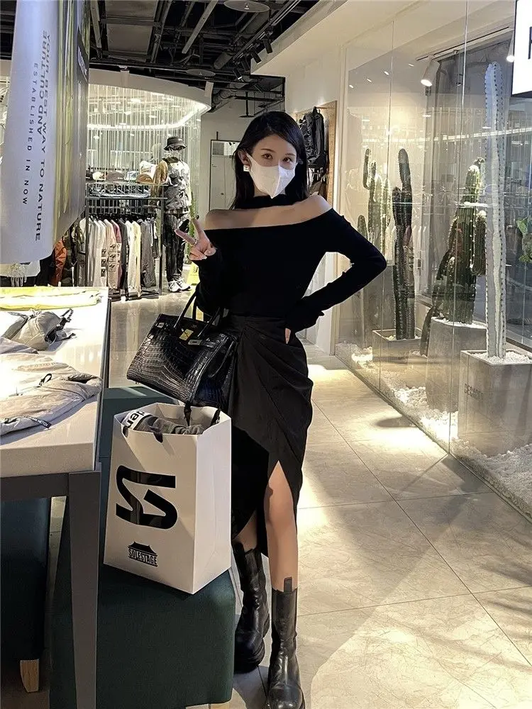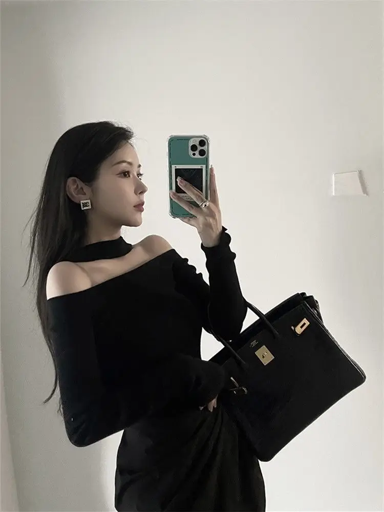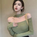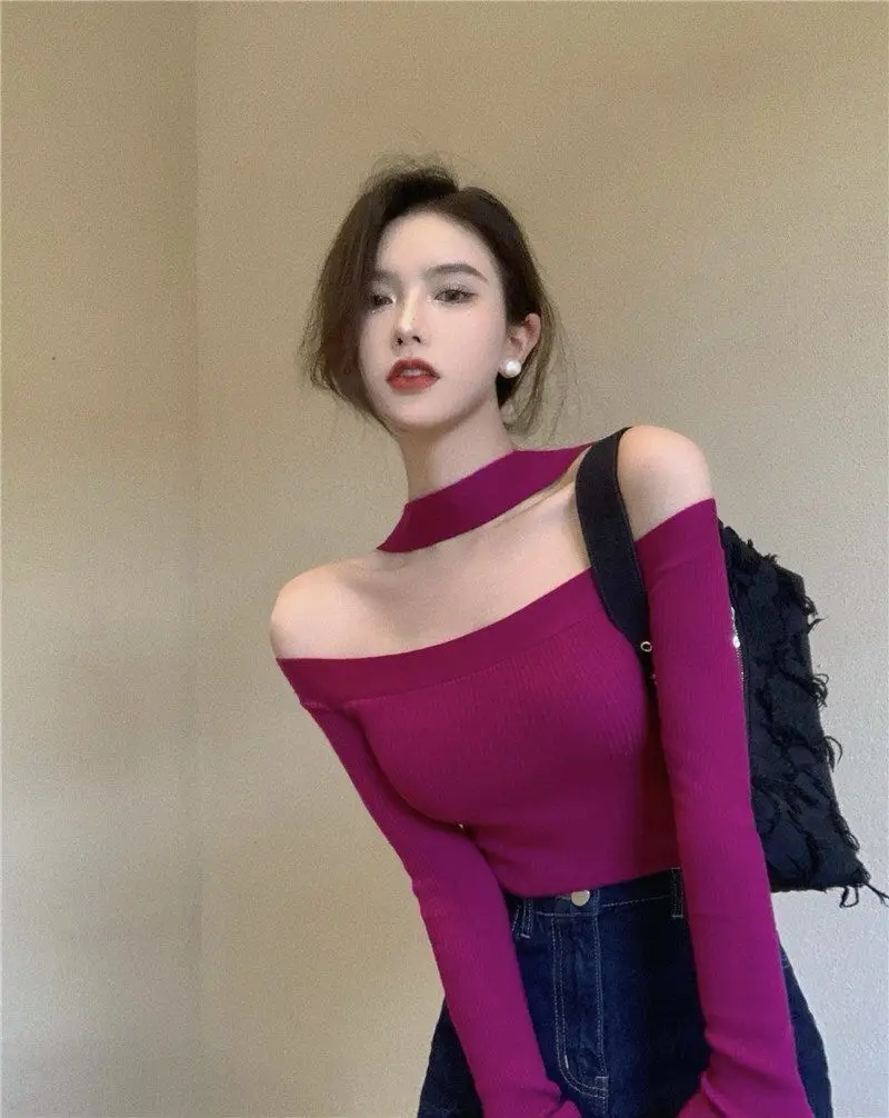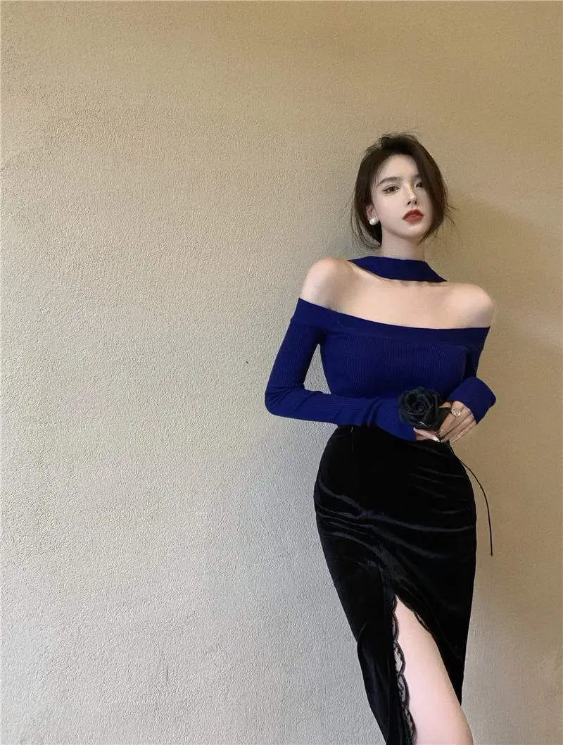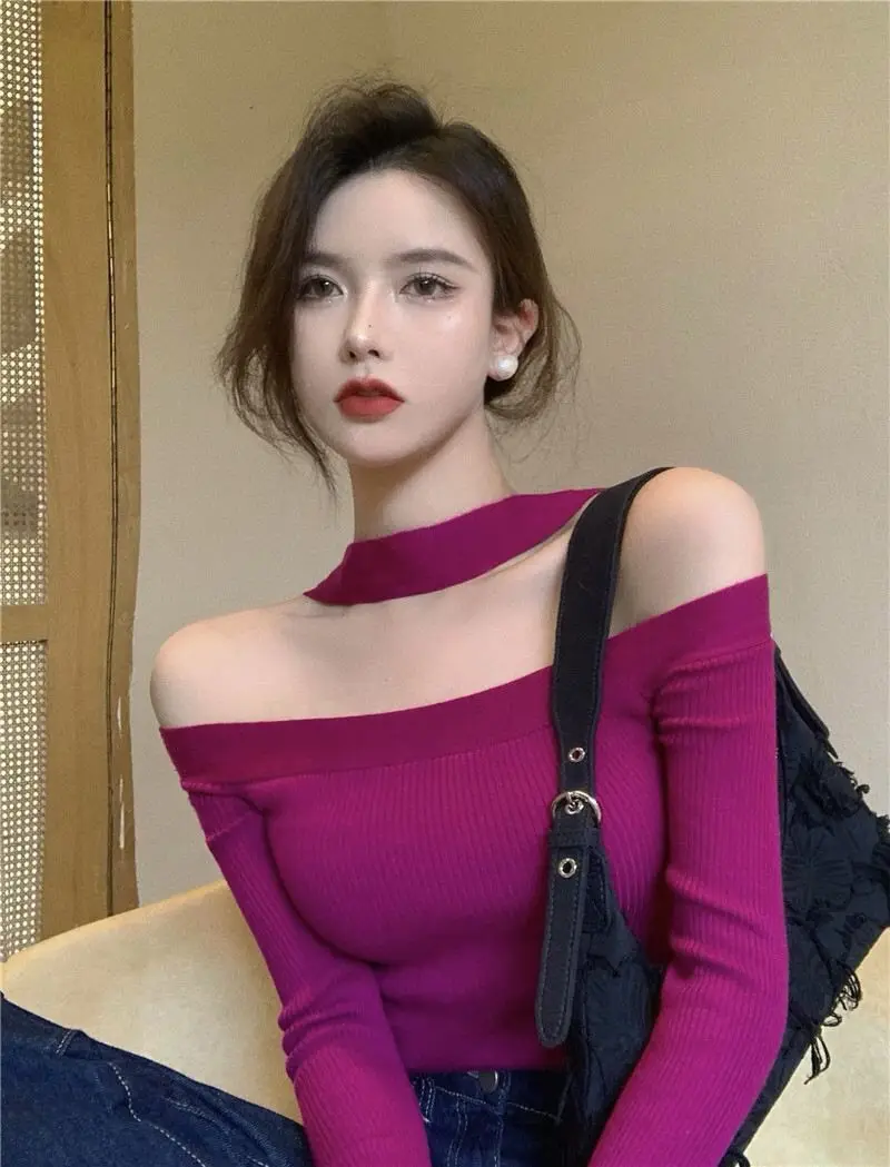 Bxoxo Vintage Knitting Short Tops Tees Spring Autumn New Long Sleeve Slash Neck Solid Slim Bottoming Shirt Sexy Fashion Women Clothing