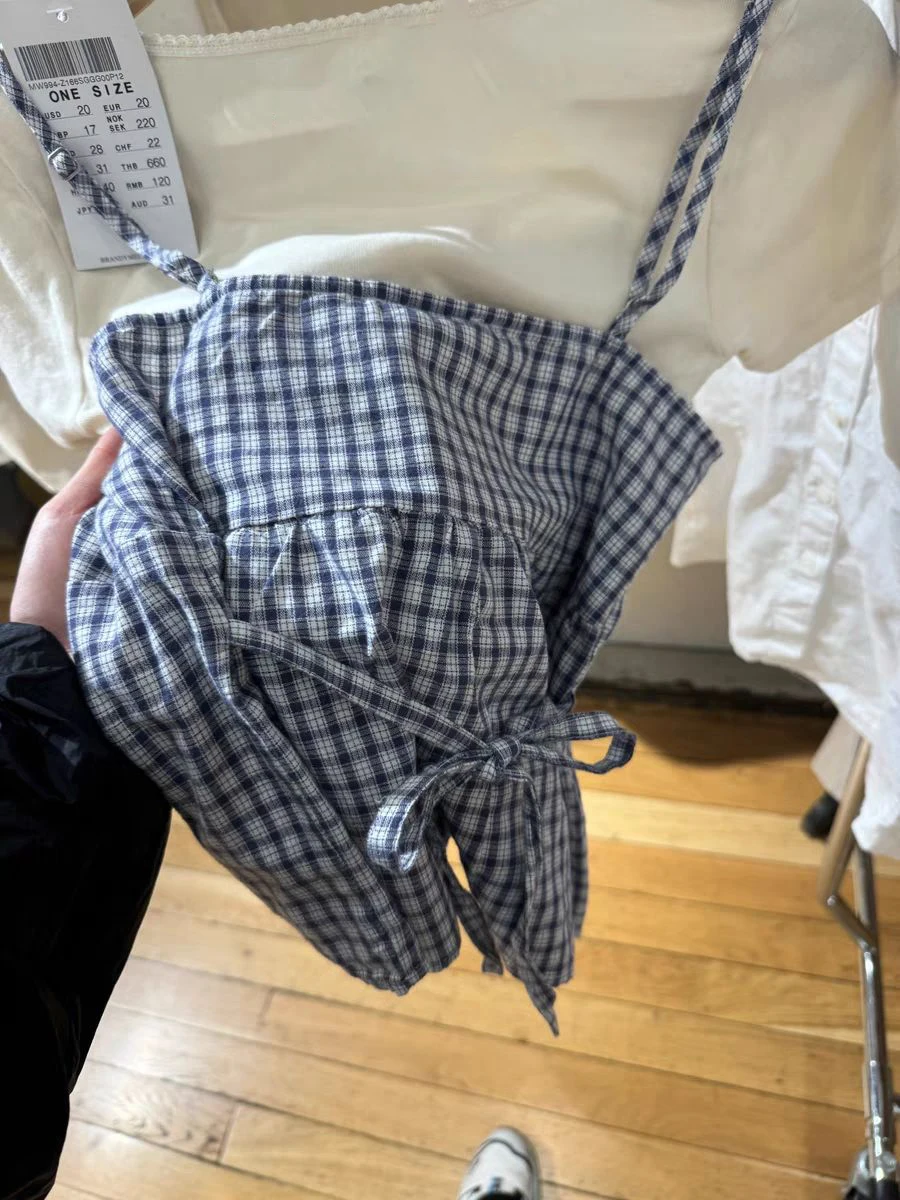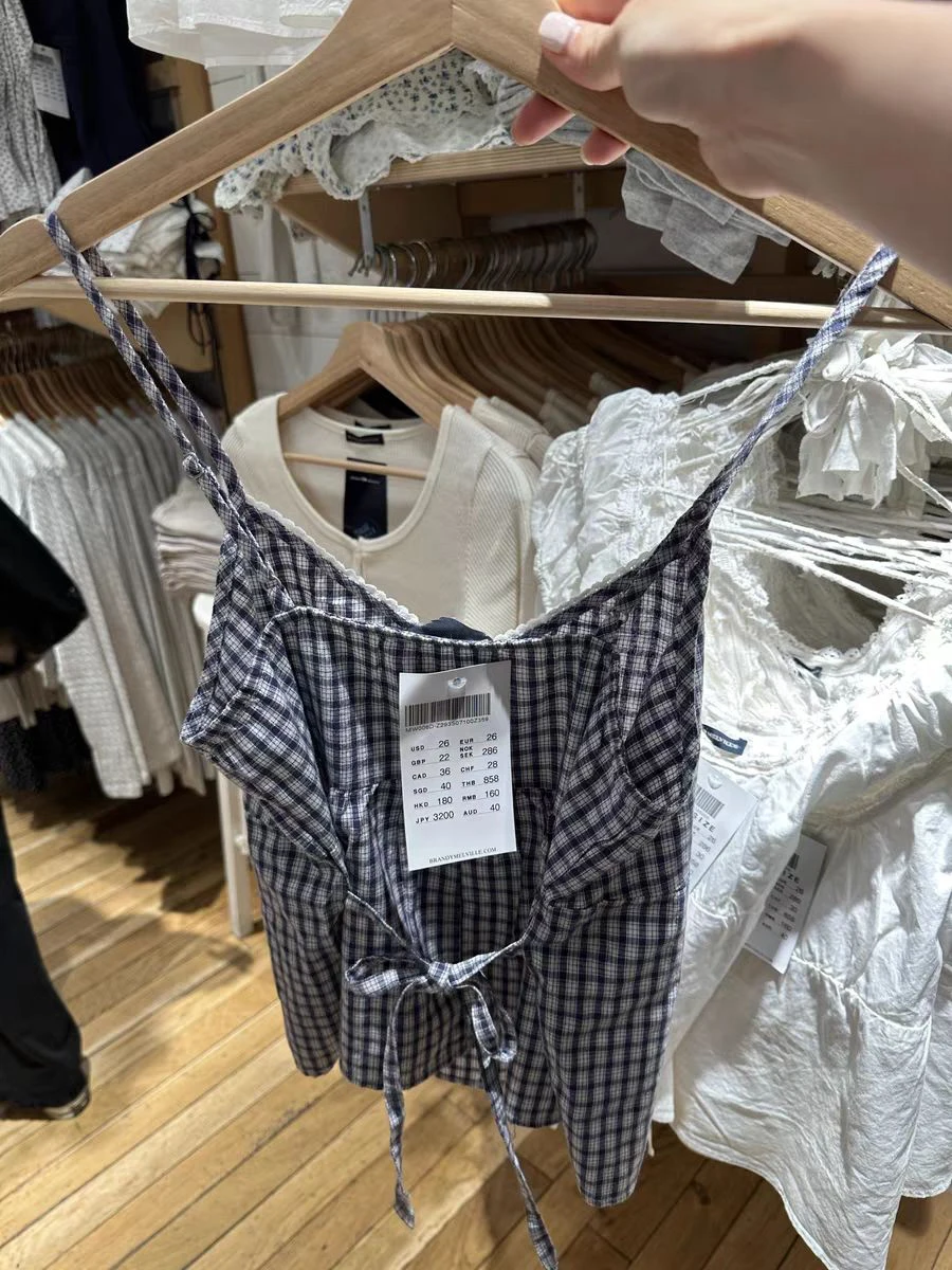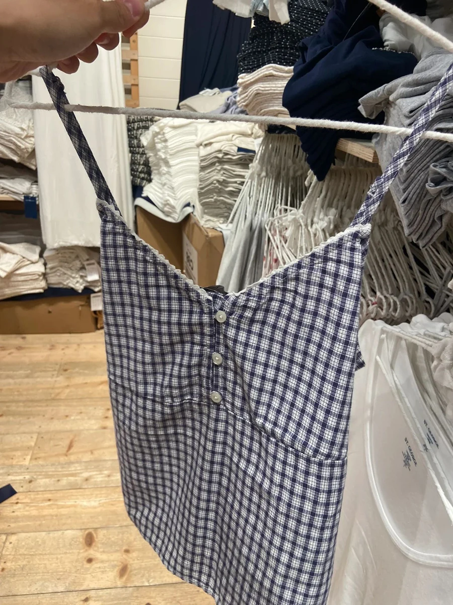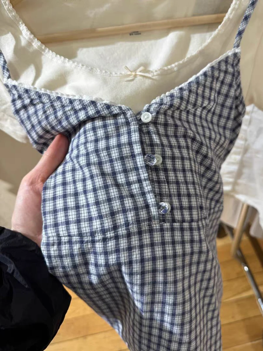 BXOXO Vintage Navy Plaid Tank Top Woman Lace Trim V-neck Buttons Back Lace-up Cotton Camis Summer Casual Streetwear Sweet Slim Vest