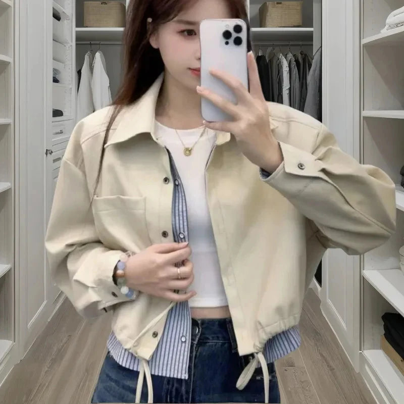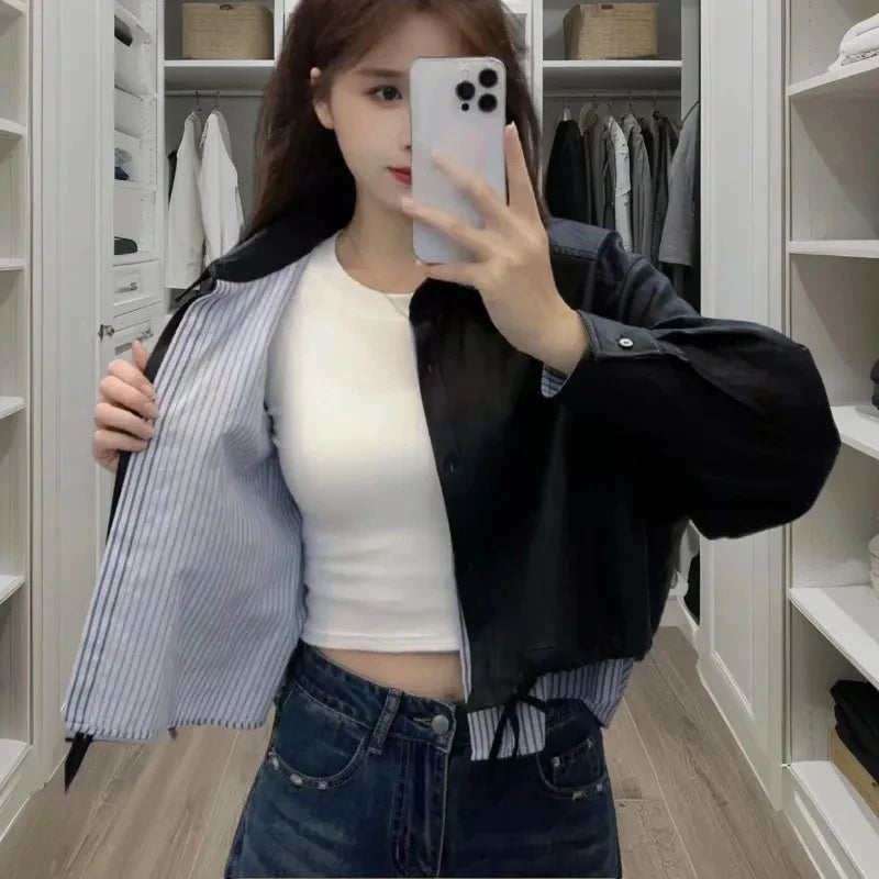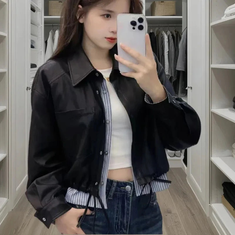 Bxoxo Vintage Patchwork Crop Jacket for Women Autumn Streetwear Splicing Pu Leather Outerwear Y2K Gothic Single Breasted Female Coat