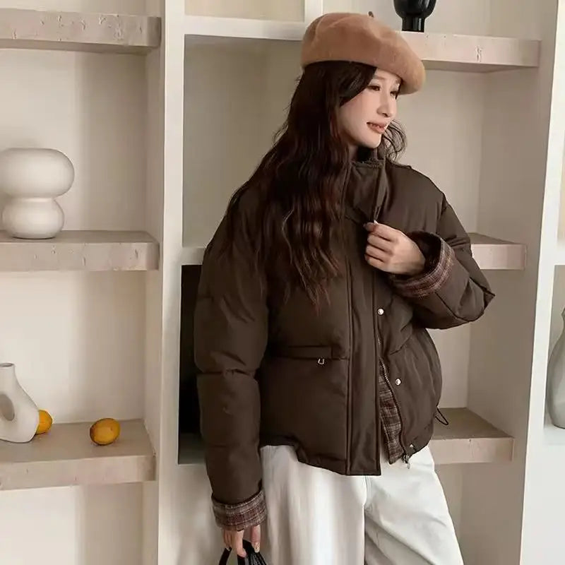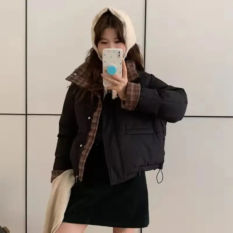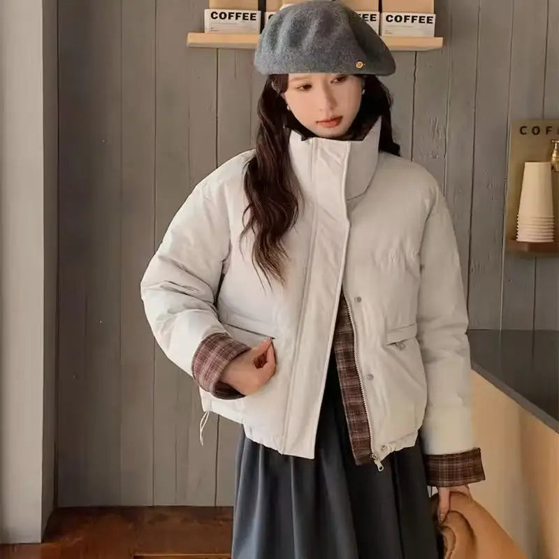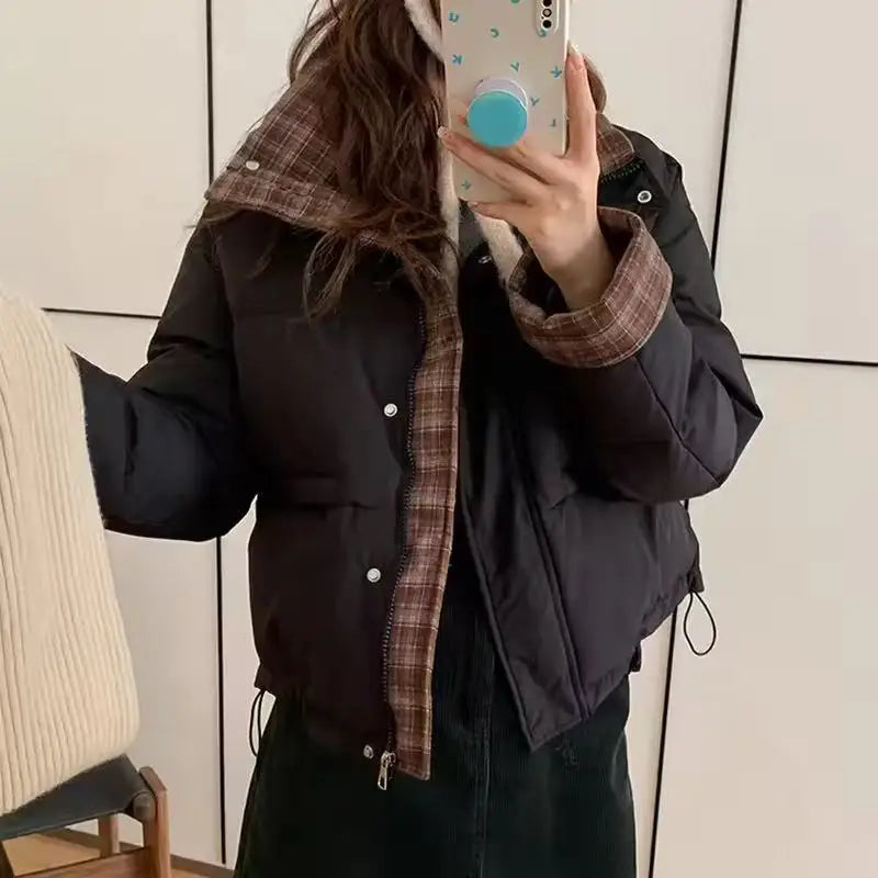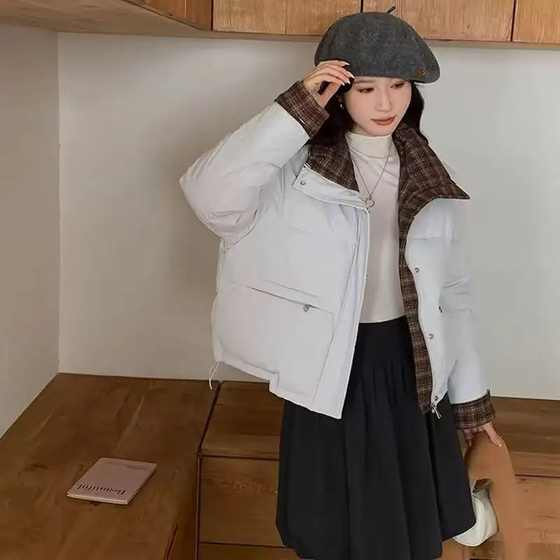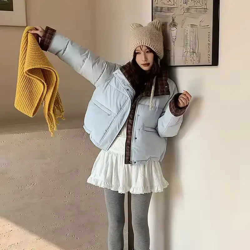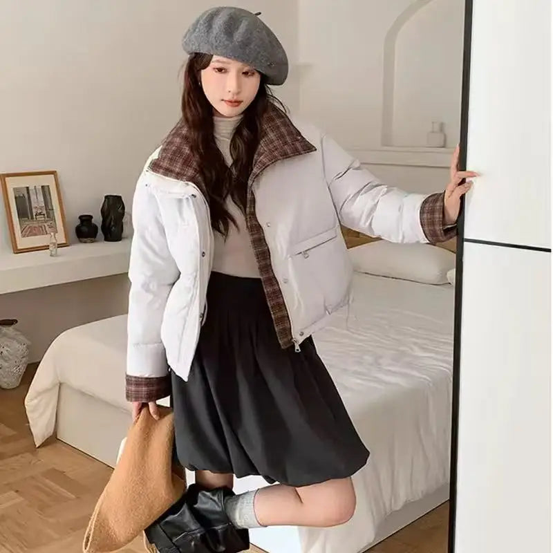 Bxoxo Vintage Plaid Patchwork Parkas Women Winter Warm Stand Collar Crop Coats Y2K Korean Streetwear Loose Puffer Outerwear Mujer