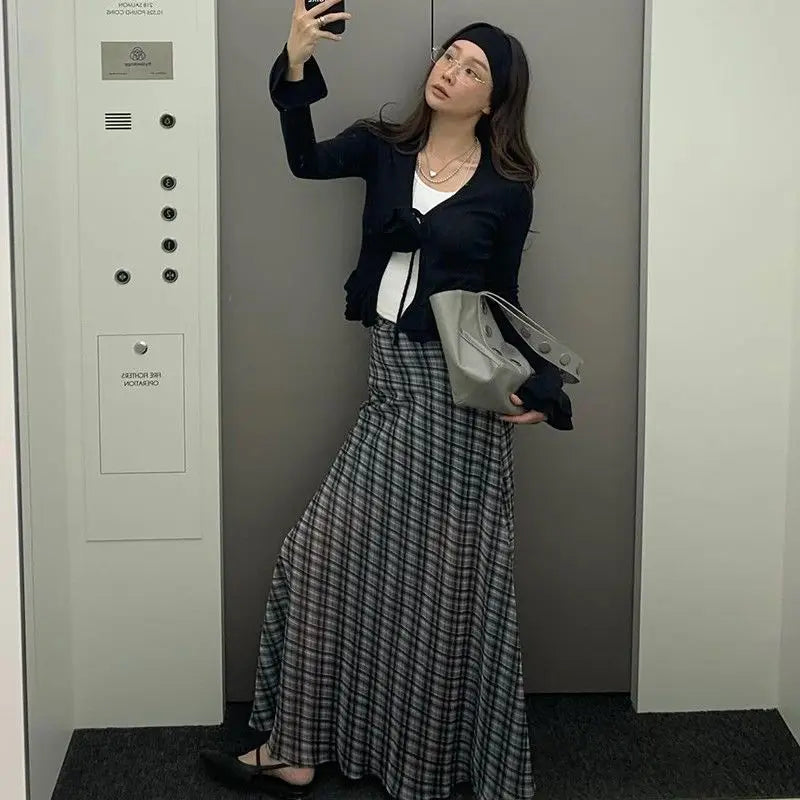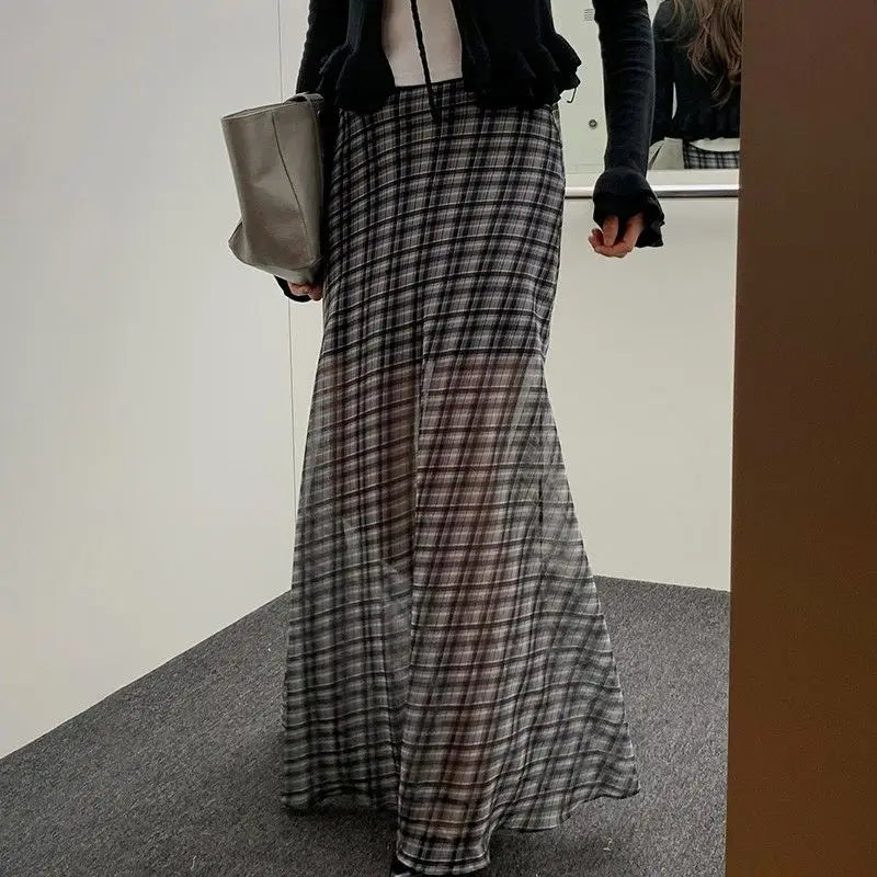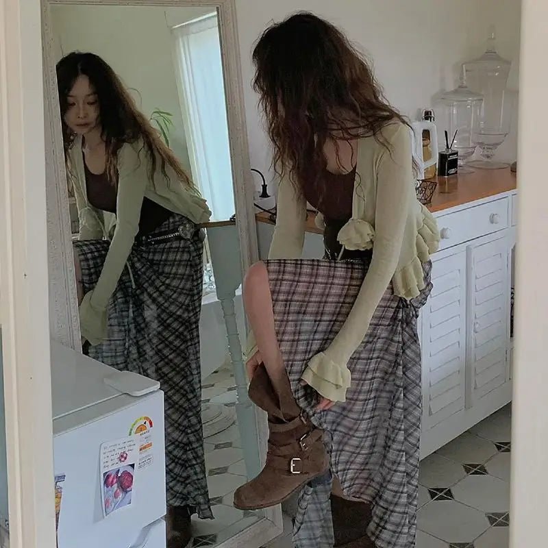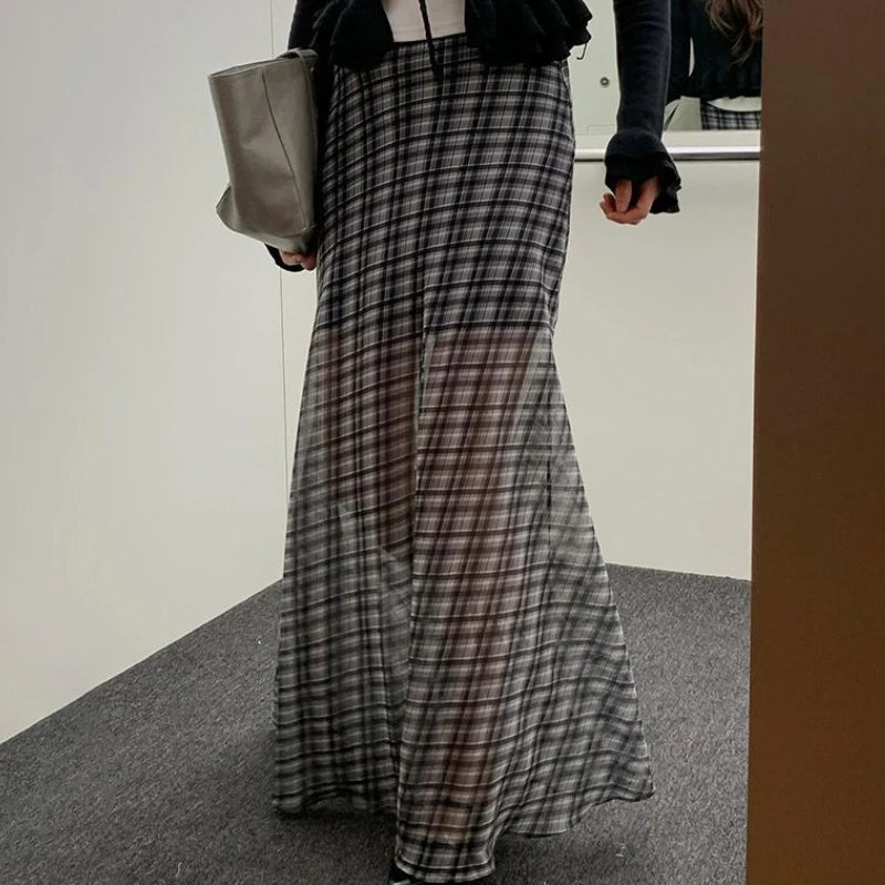 Bxoxo Vintage Plaid Skirt Women Korean Style Y2k Mesh Long Skirts Elegant Sweet Harajuku Retro Fashion Skirts Streetwear