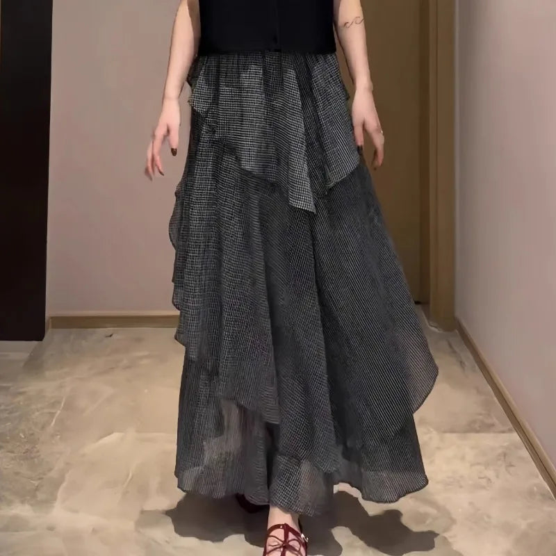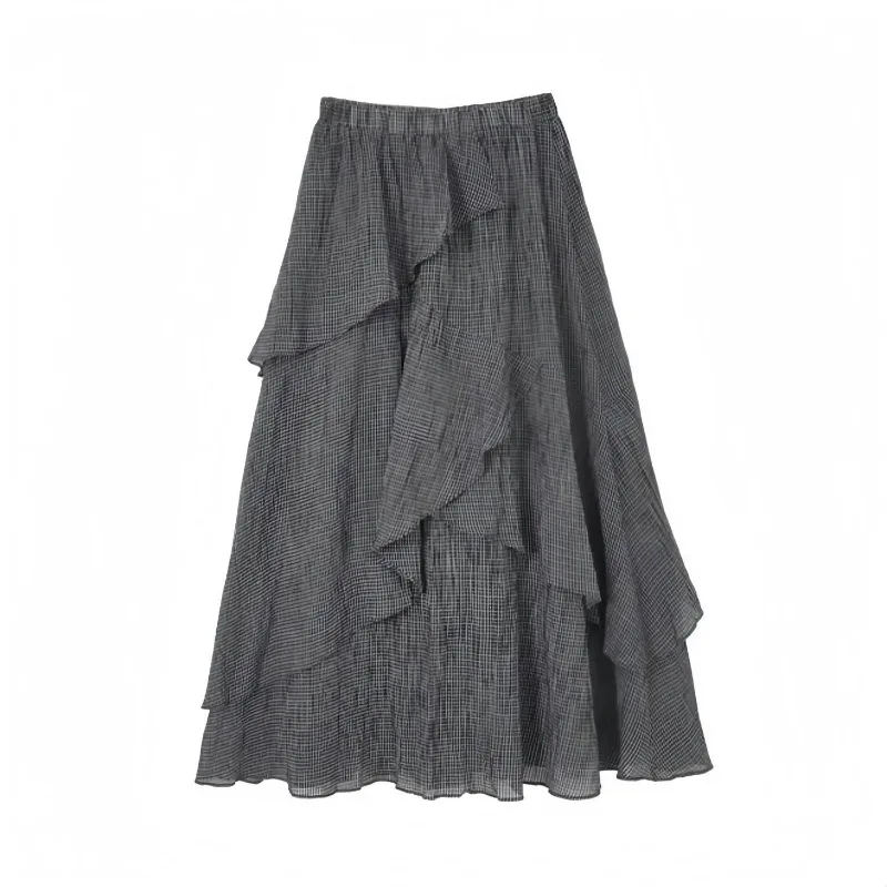 BXOXO Vintage Plaid Skirts Women Irregular High Waist 2025 Fashion Ruffles French Style Chic Elegant Ladies Long Skirt Casual
