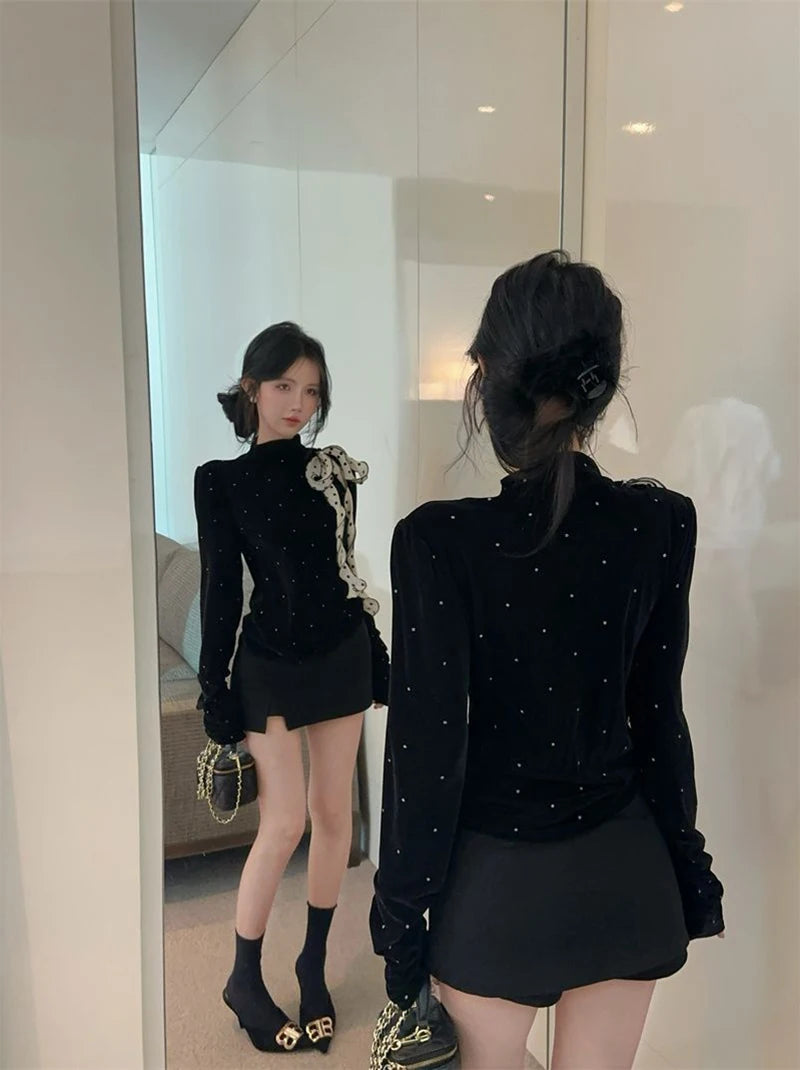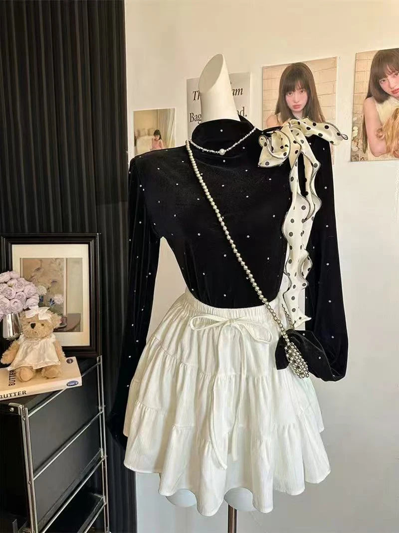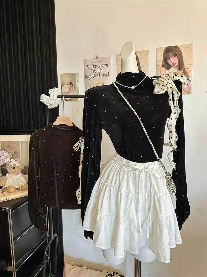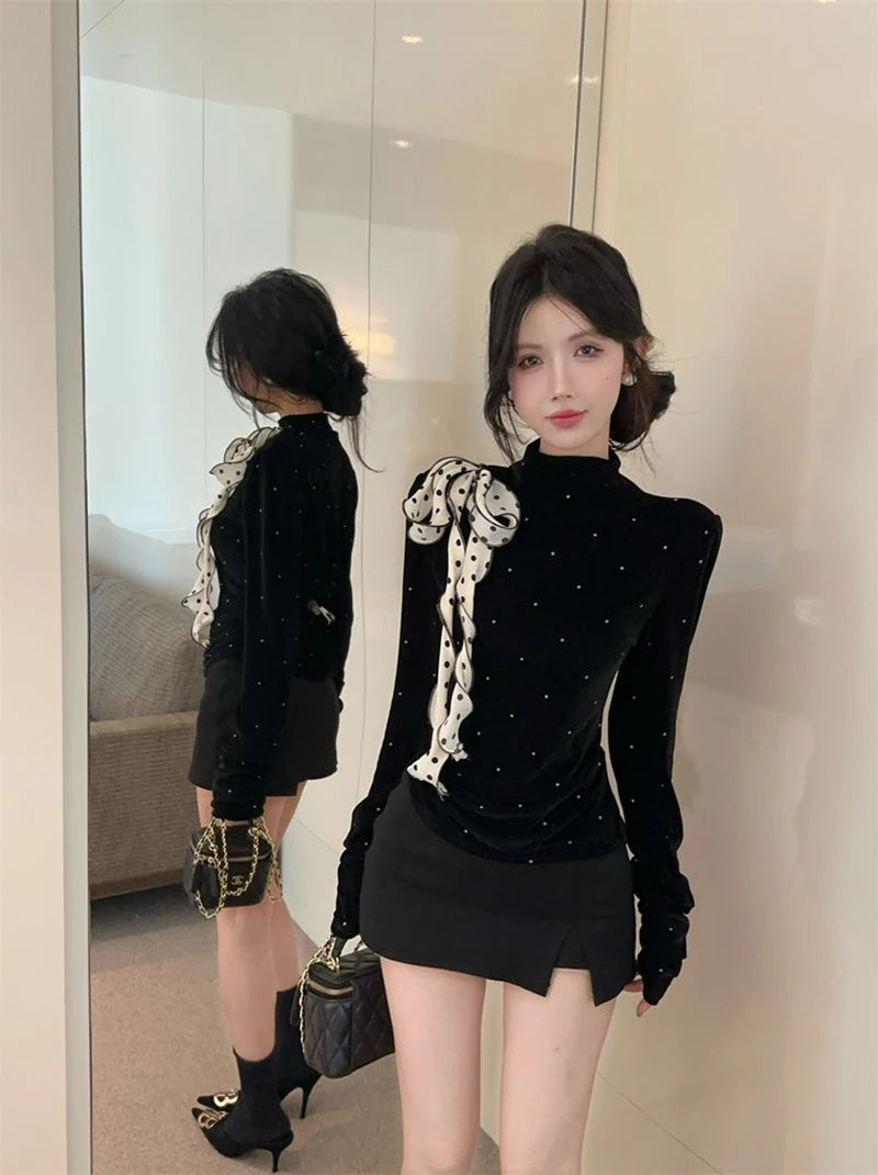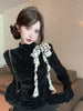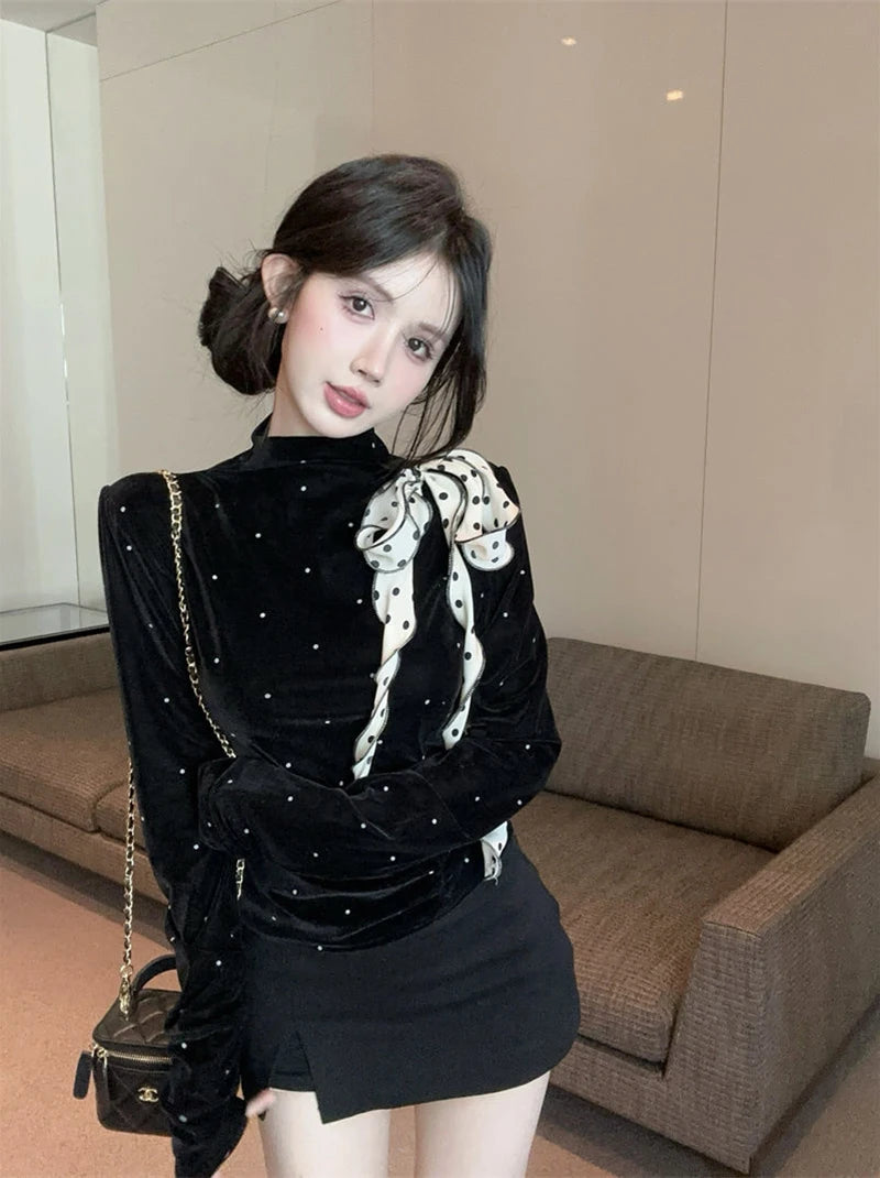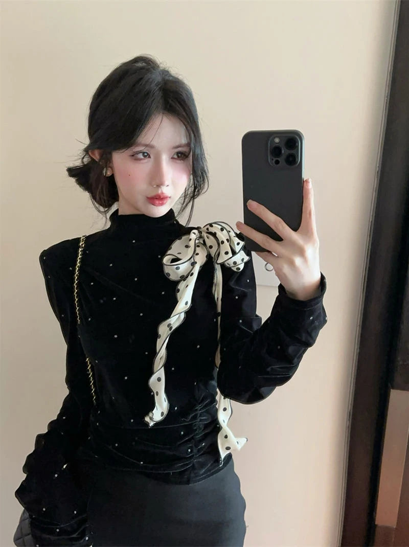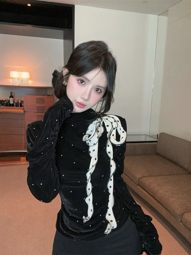 Bxoxo Vintage Polka Dots Velvet Tops Women Y2K Autumn Korean Chic Folds Slim Long Sleeve T Shirt Elegant Bow Lace Up Ladies Pullover