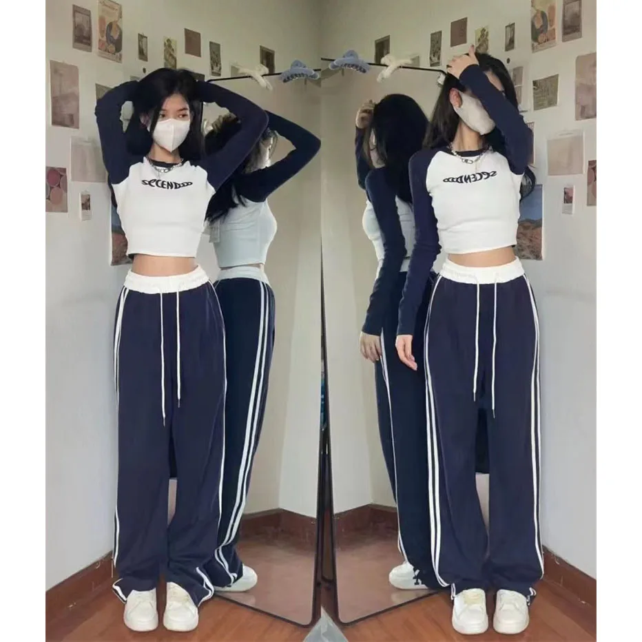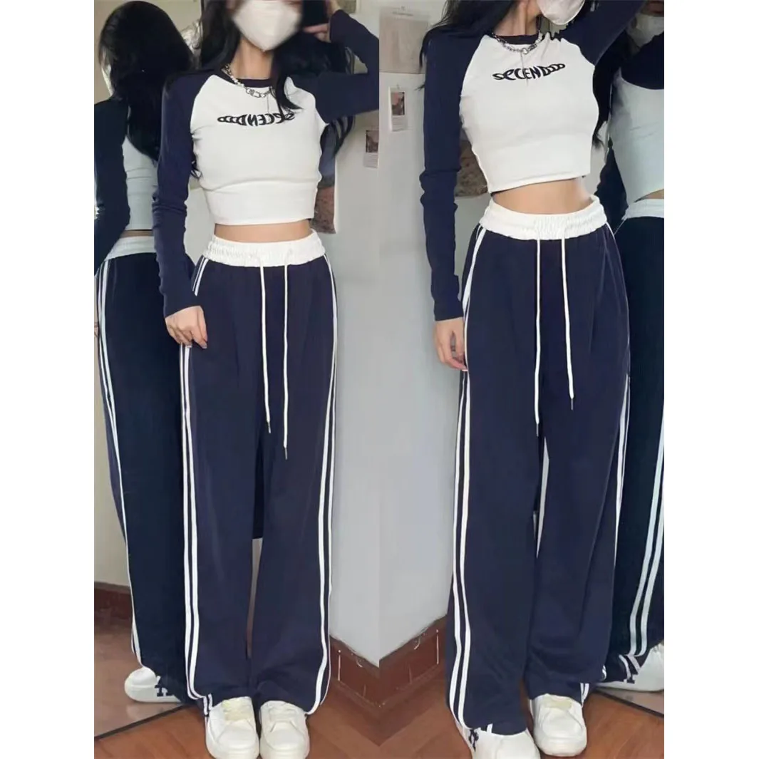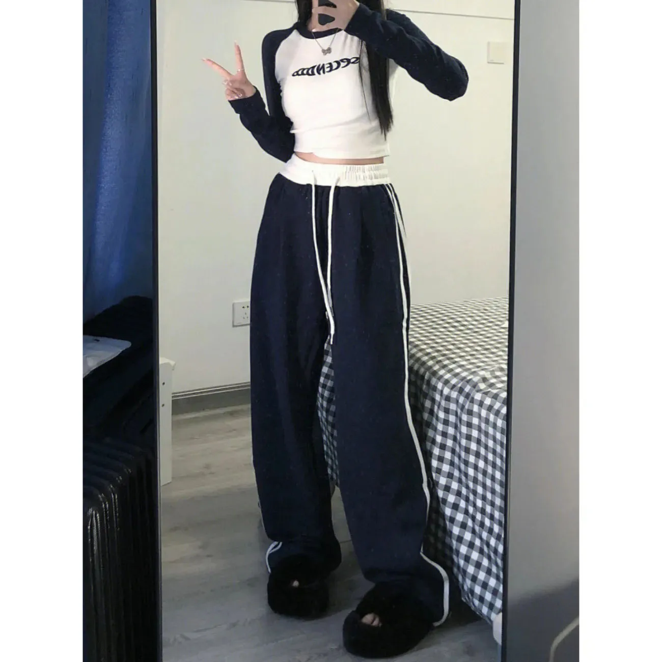 Bxoxo Vintage Stripe Women Wide Leg Pants Y2K Autumn High Waist Baggy Casual Sweatpants Harajuku Korean All Match Straight Trousers