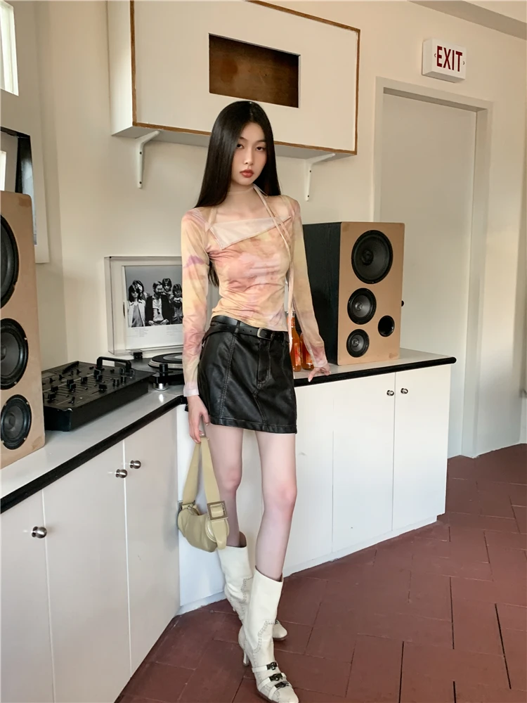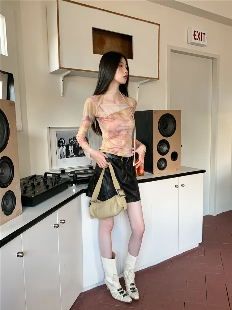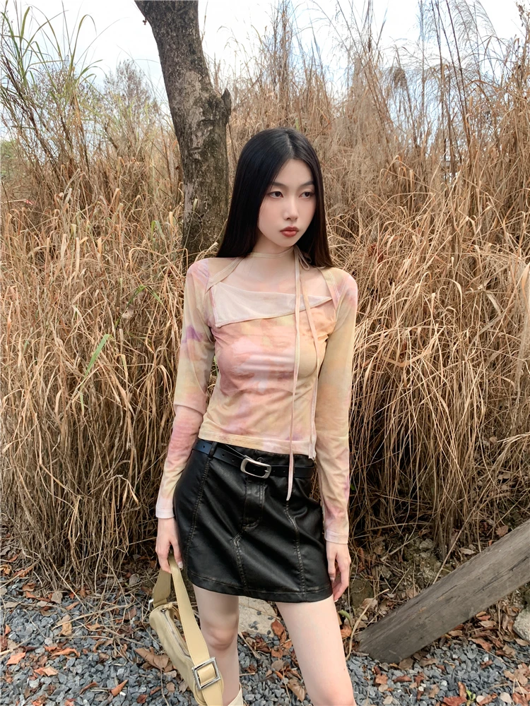 BXOXO Vintage Tie Dye T Shirt Women Flare Sleeve Mesh Tops Irregual Y2k Retro Crop Tops Streetwear Japanese 2000s Tshirts