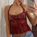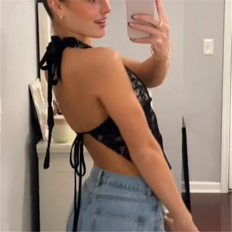 BXOXO Vintage Transparent Lace Tees Sexy Backless Bandage Halter Crop Tops Women Chic Patchwork Tees Ladies Summer Clubwear