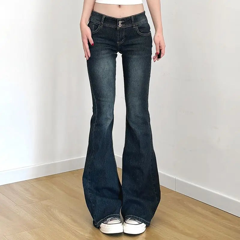 Bxoxo Vintage Washed Basic Flared Jeans Women Low Waist American Style Slim Denim Pants Button-up Trousers Casual Aesthetic