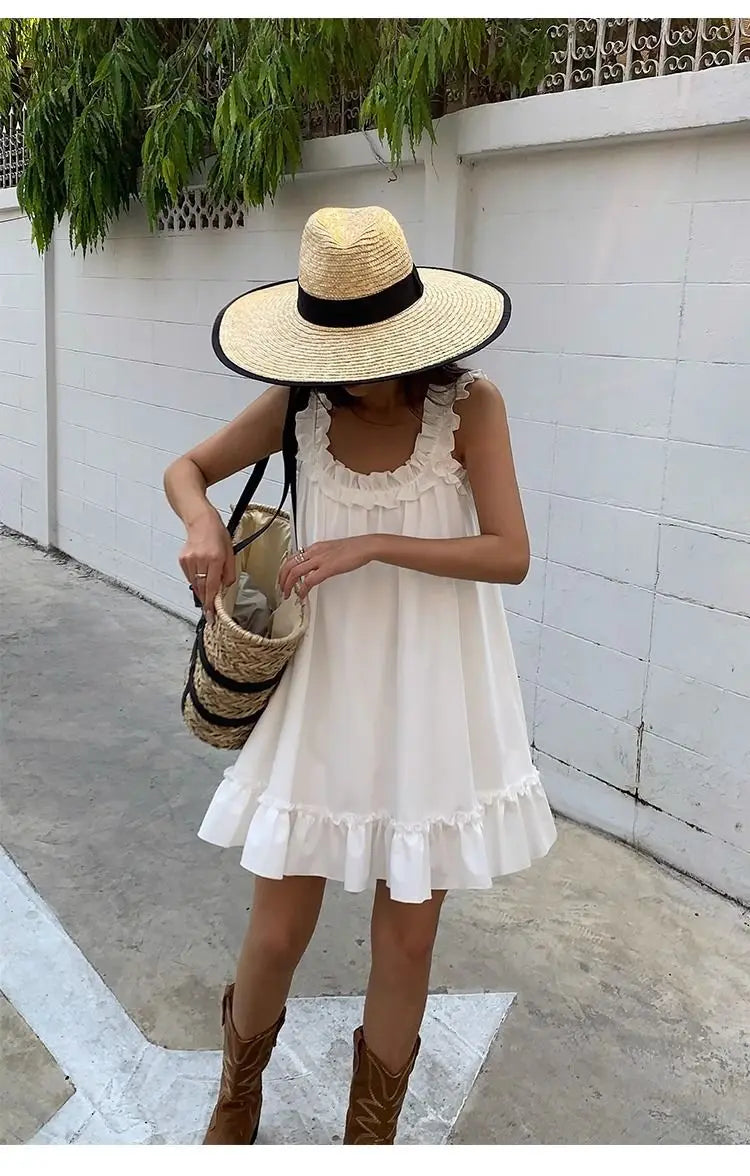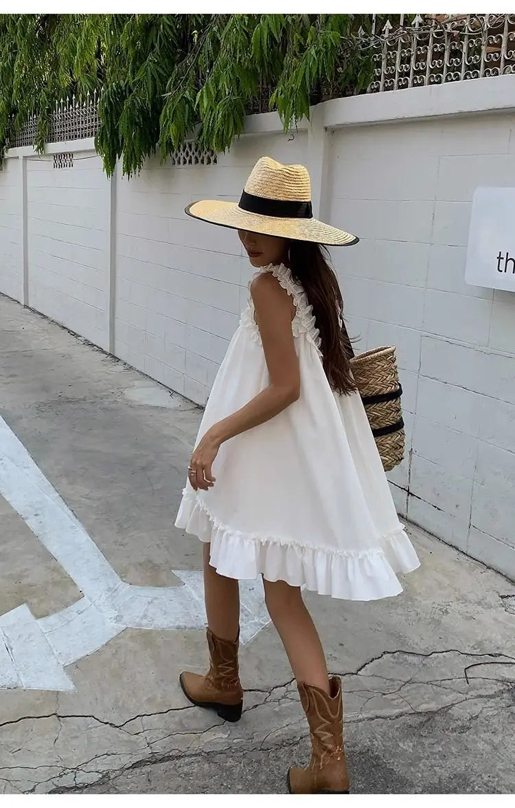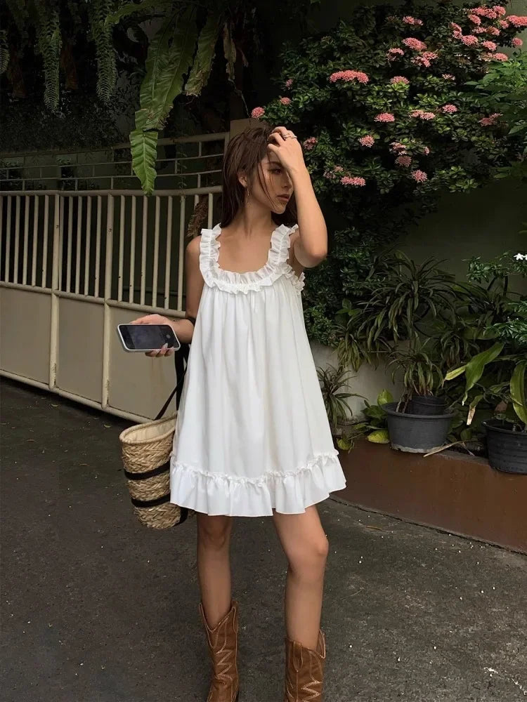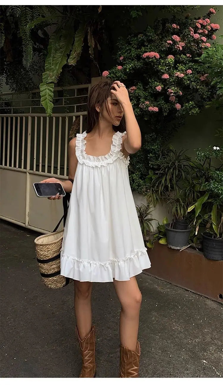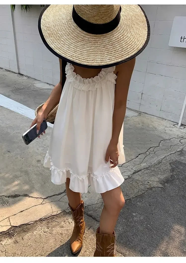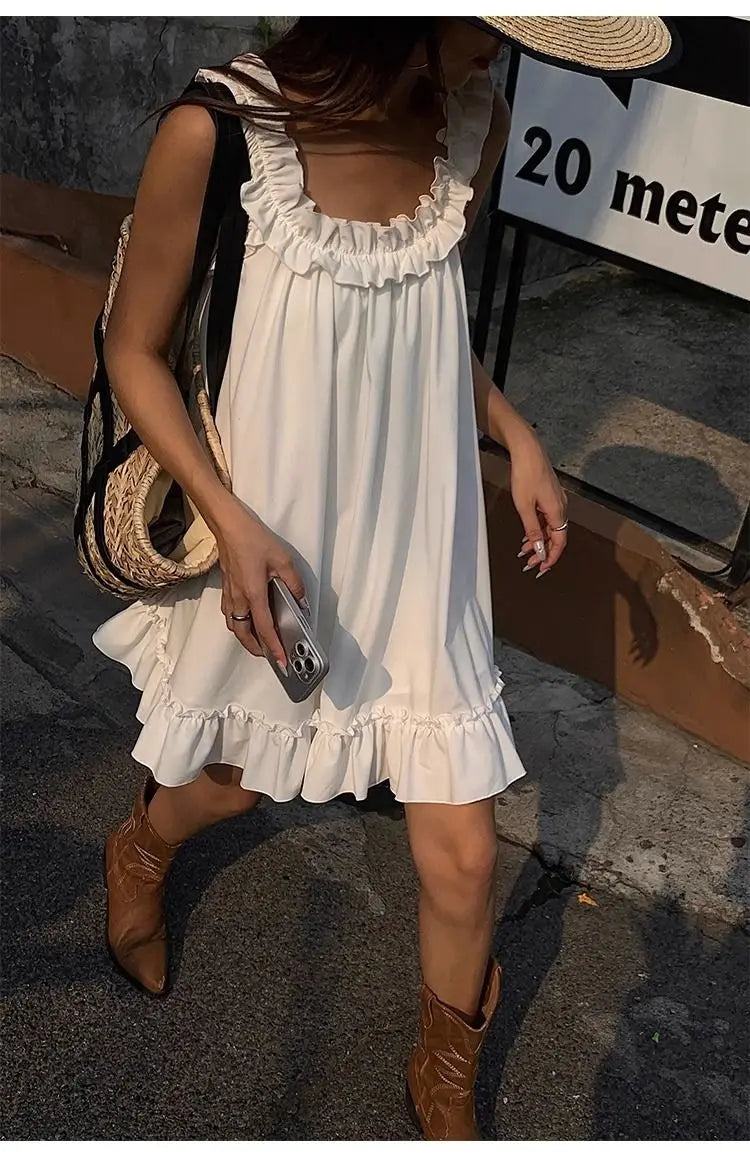 Bxoxo White Sleeveless Ruffles Mini Dress Women Casual Boho Beach Sundress Cute Girl Home Dresses Loose Summer Dress Oversize