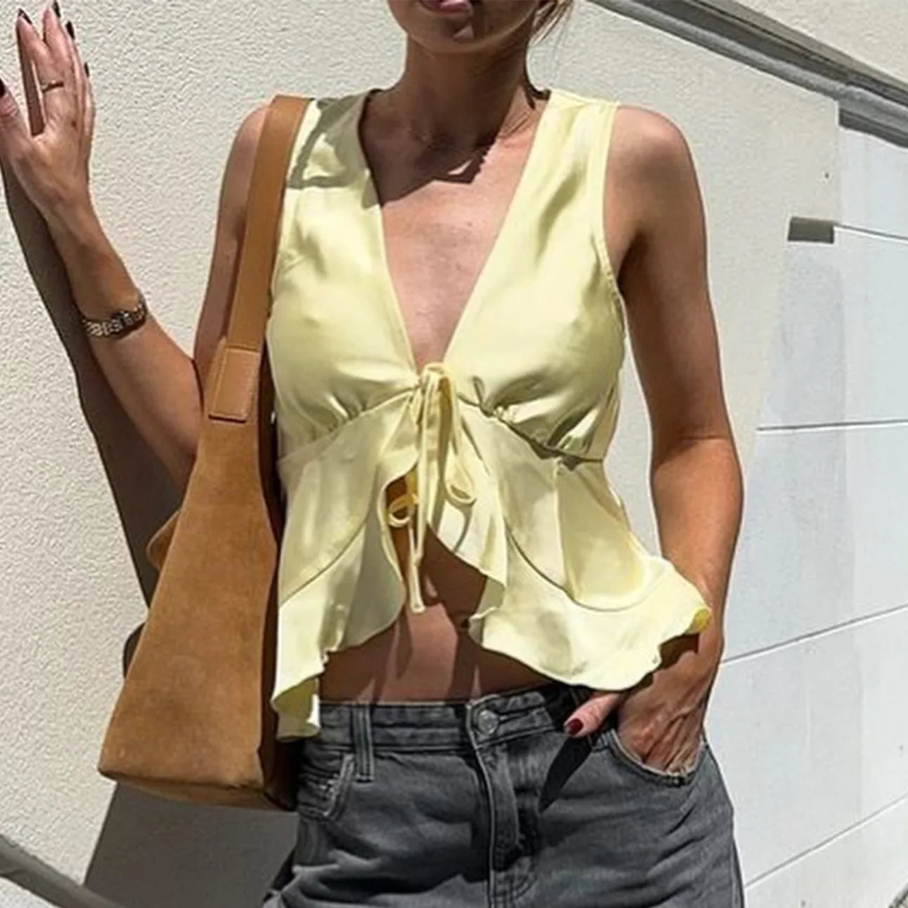 BXOXO Women Fashion Satin Vest Sleeveless Lace Up Front Ruffle Hem Tank Top Solid Color Tie Camisole Summer Going Out Top