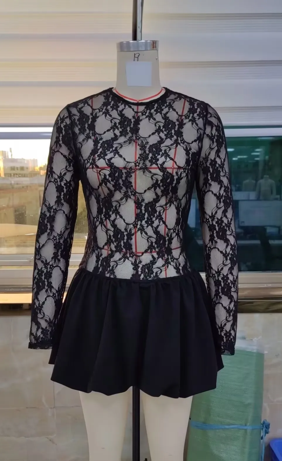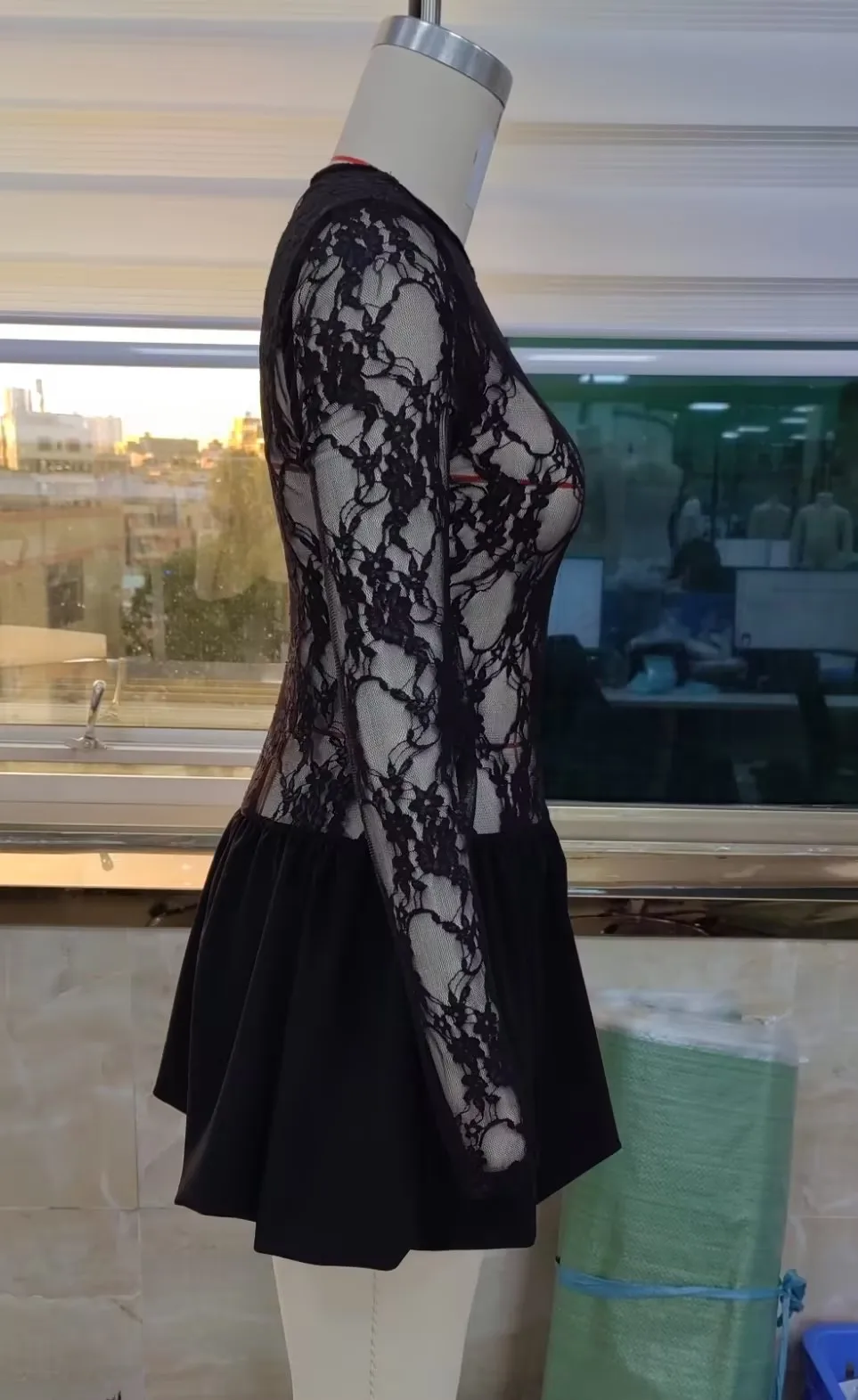 BXOXO Women Mini Dress Sexy Lace Patchwork Mock Neck Long Sleeve Dress Spring Fall Fashion Casual Bubble Dress Party Clubwear