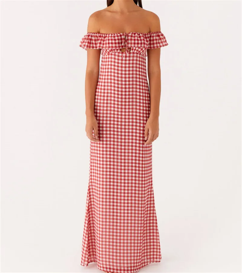 BXOXO Women Off Shoulder Long Dress Slim Dot/Plaid Tie-up Cut Out Ruffle Sleeve Backless Bodycon Dress for Party Club