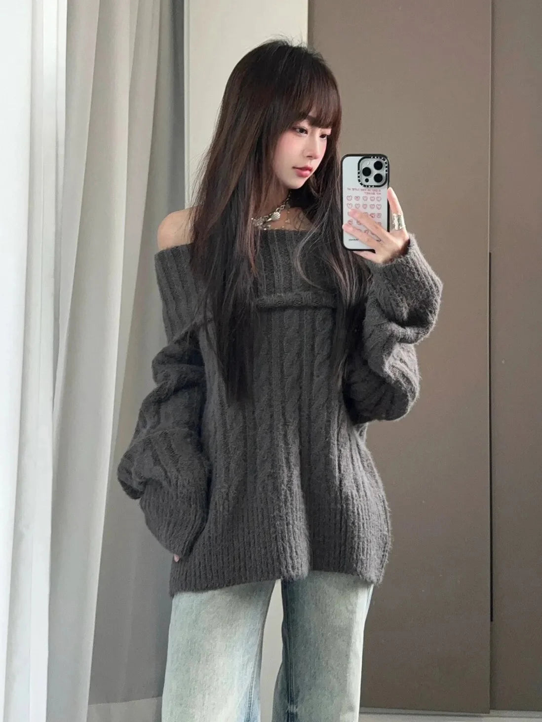 Bxoxo Women Thickening Slash Neck Off Shoulder Solid Simple All-match Casual Sexy Spicy Girls Knitted Sweater Ulzzang Unique