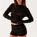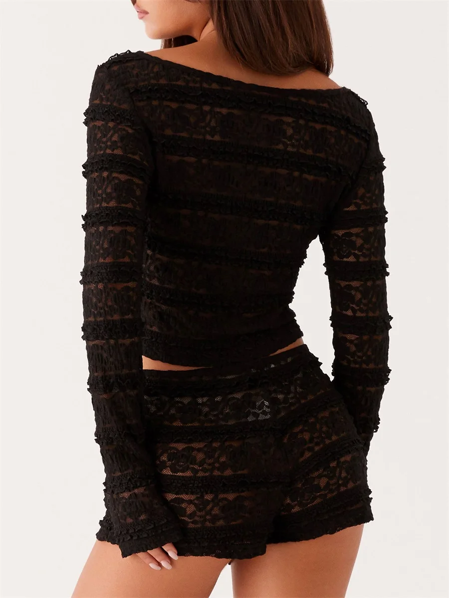 BXOXO Women Y2K Floral Lace Shorts Set 2 Piece Sheer Outfits Long Sleeve Semi See Through Top Bodycon Shorts Matching Set