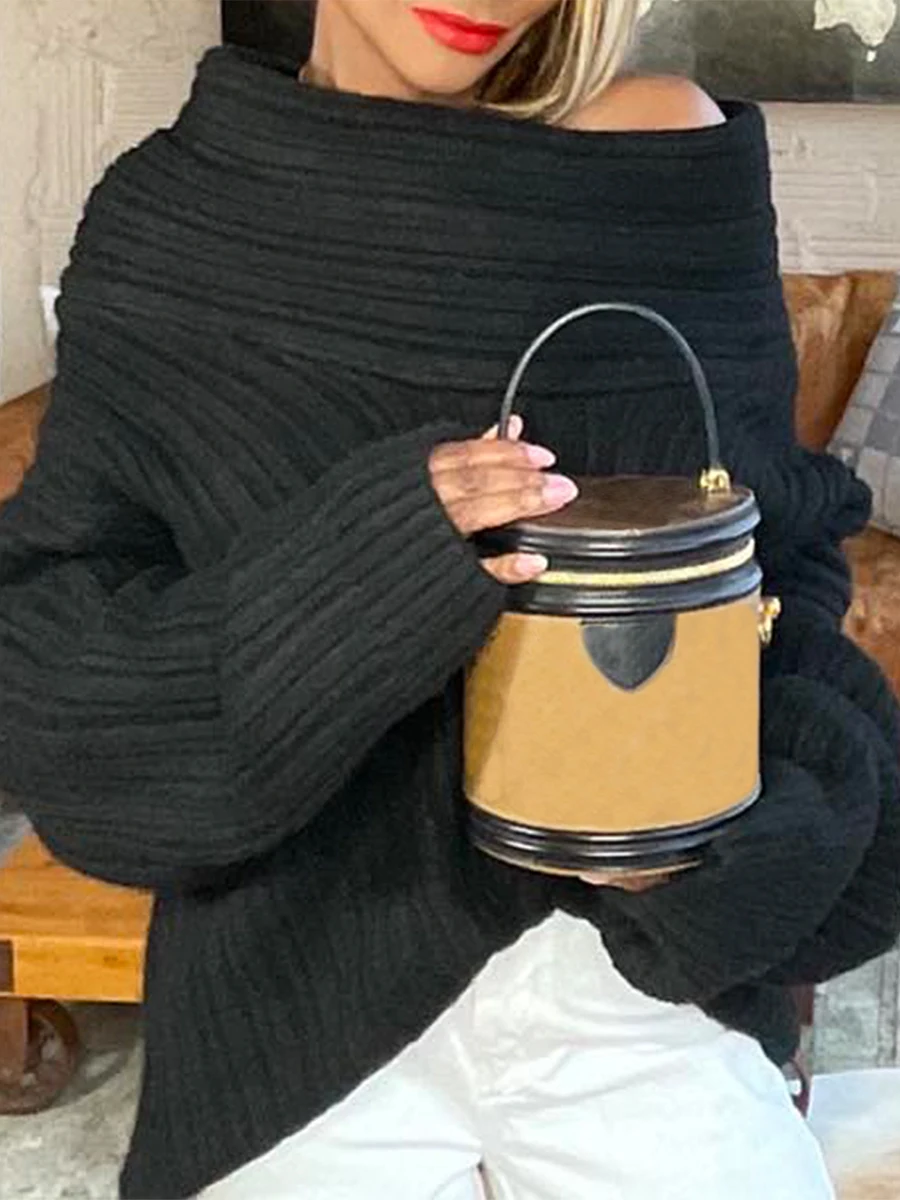 Women Loose Knit Sweater Solid Color Long Sleeve Boat Neck Off Shoulder Pullovers Fall Winter Casual Jumpers