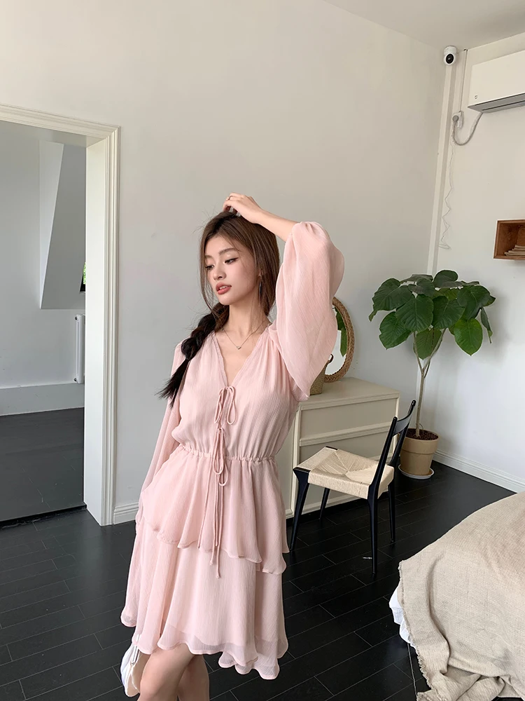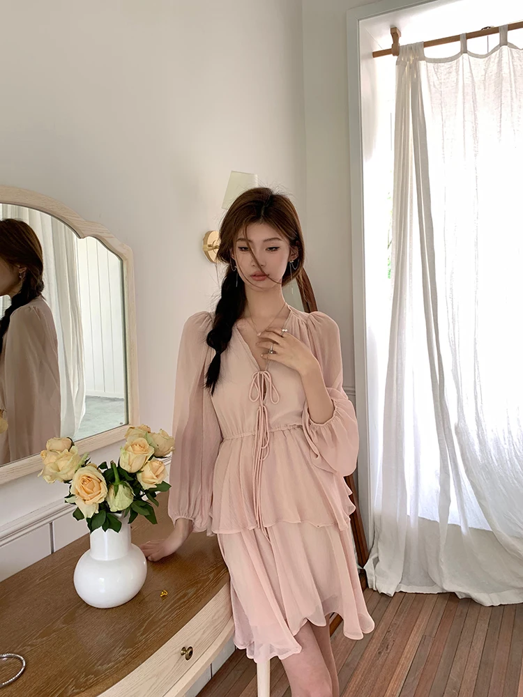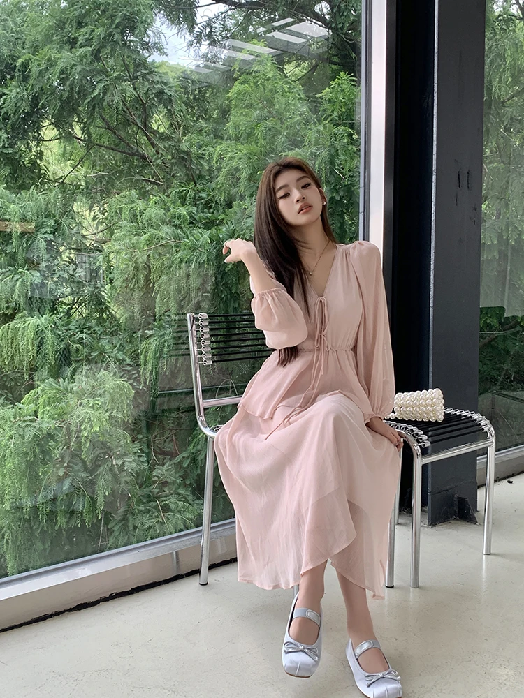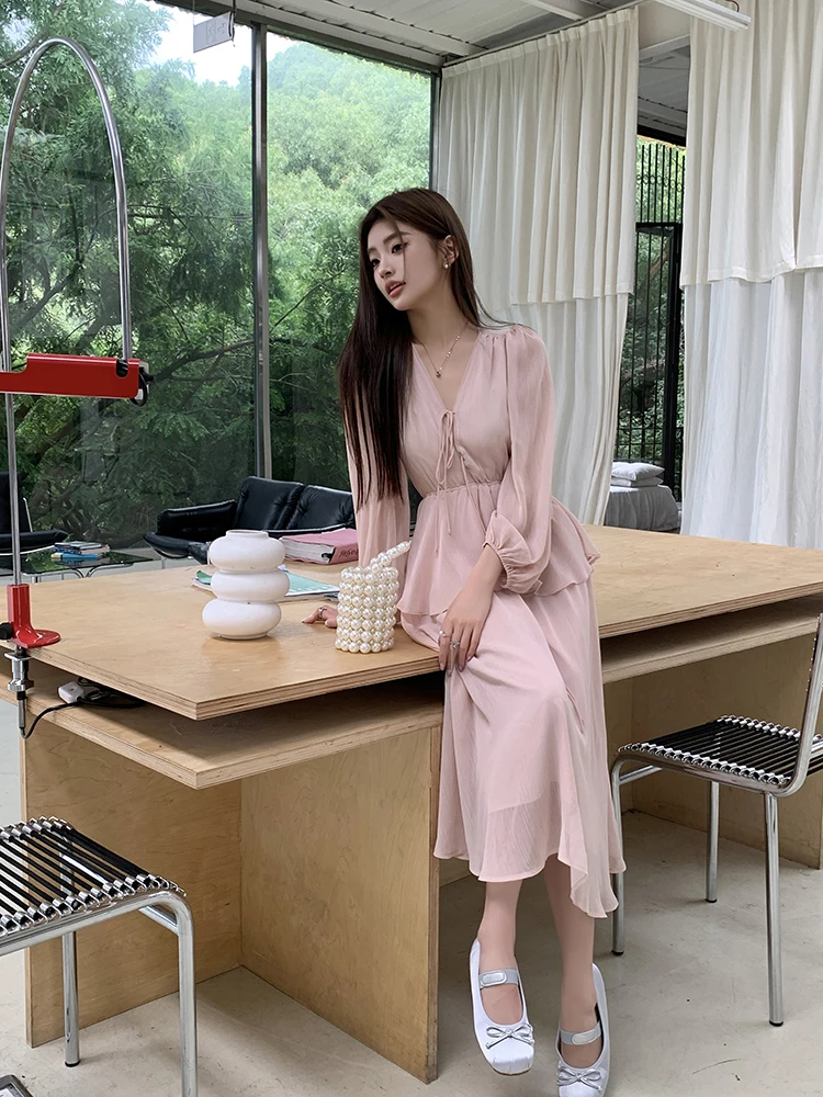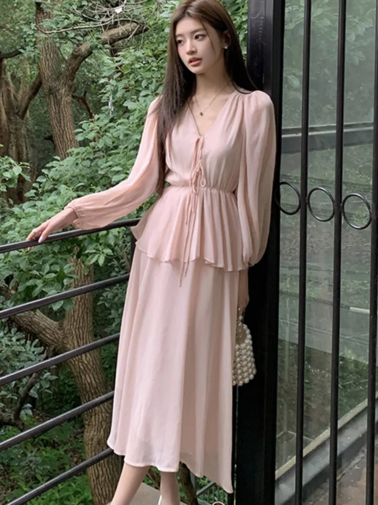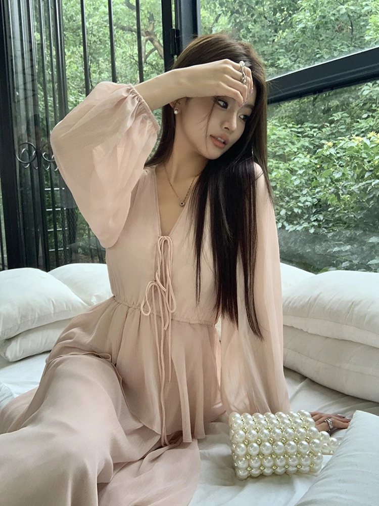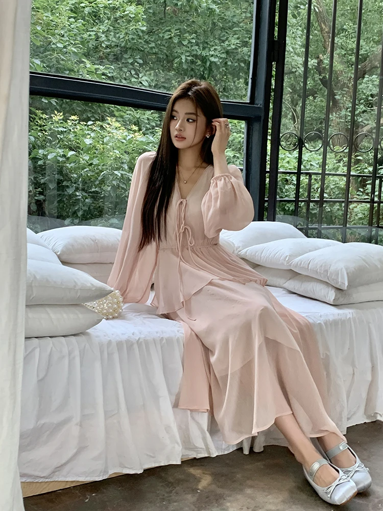 Bxoxo Women's Elegant Fairy Casual Korean Style Dresses New V-Neck Lace-up Long Lantern Sleeve Ruffles Midi Dress 2025 Holiday Vestido