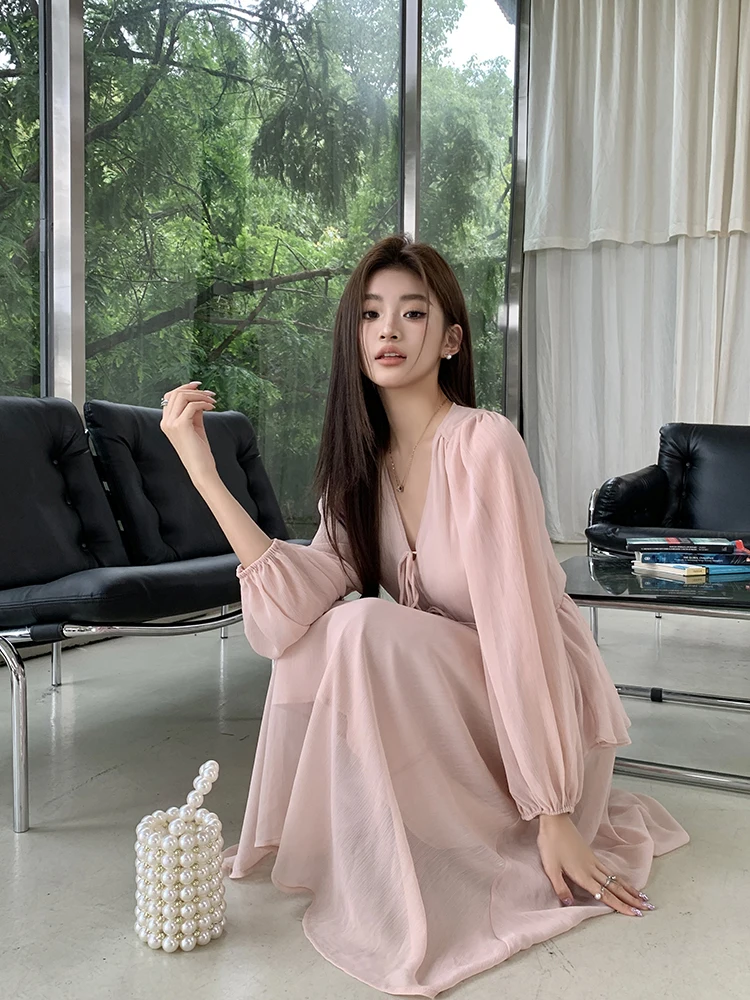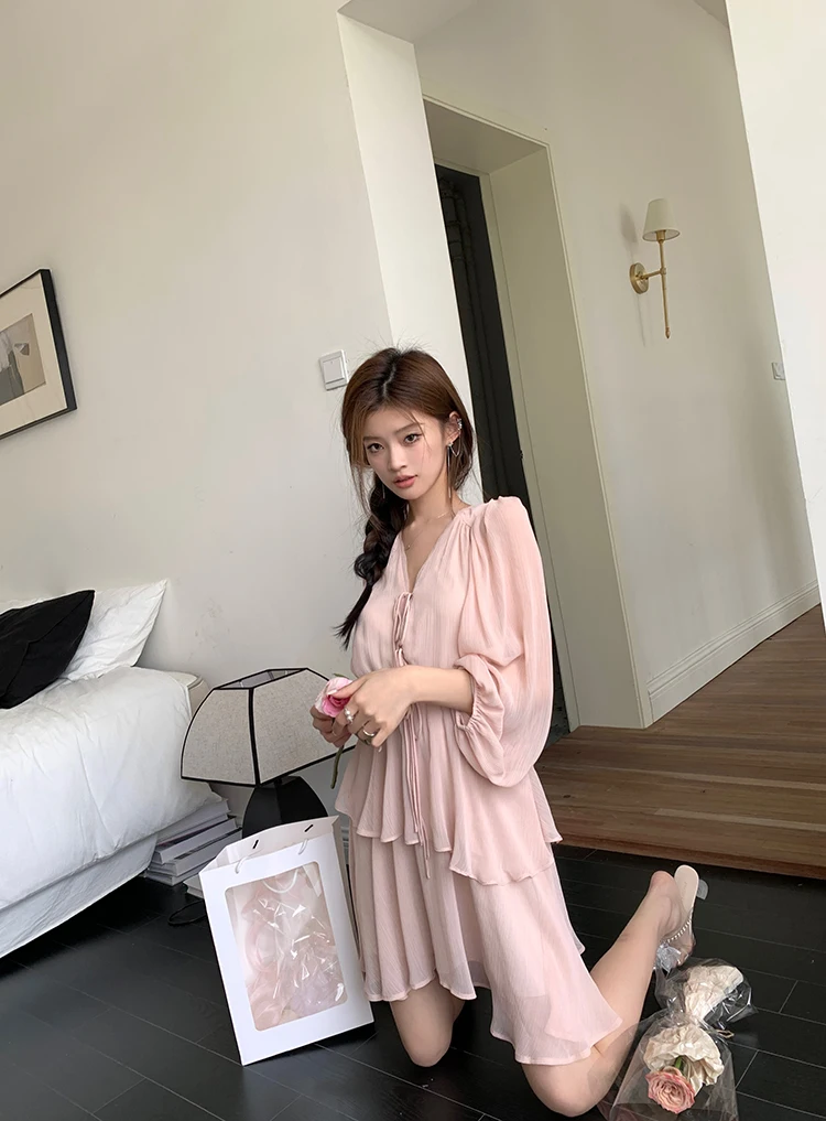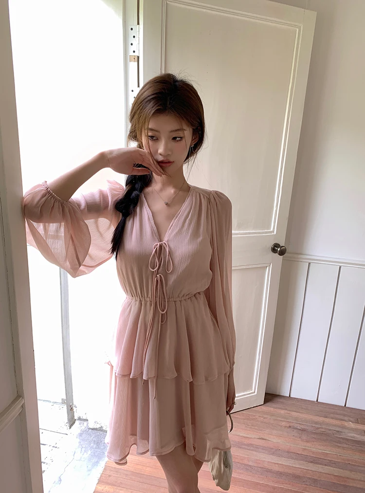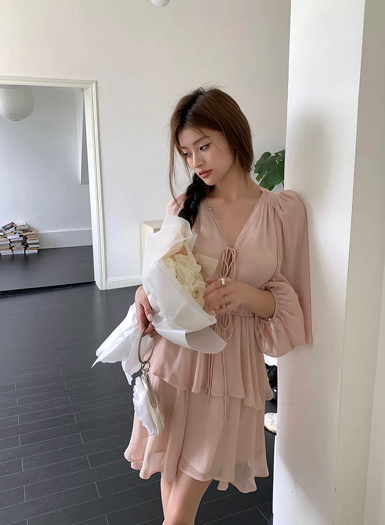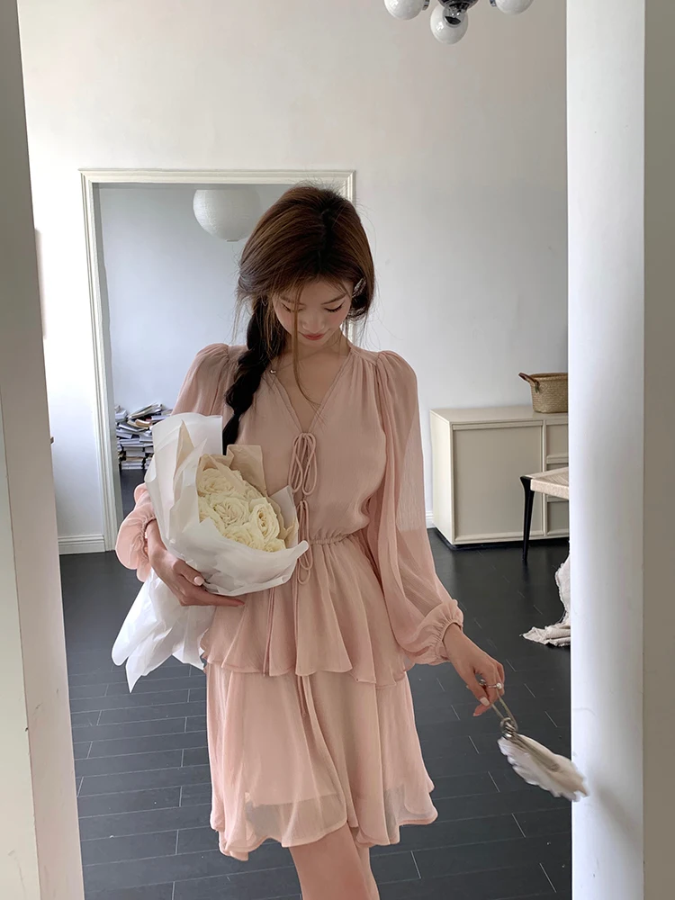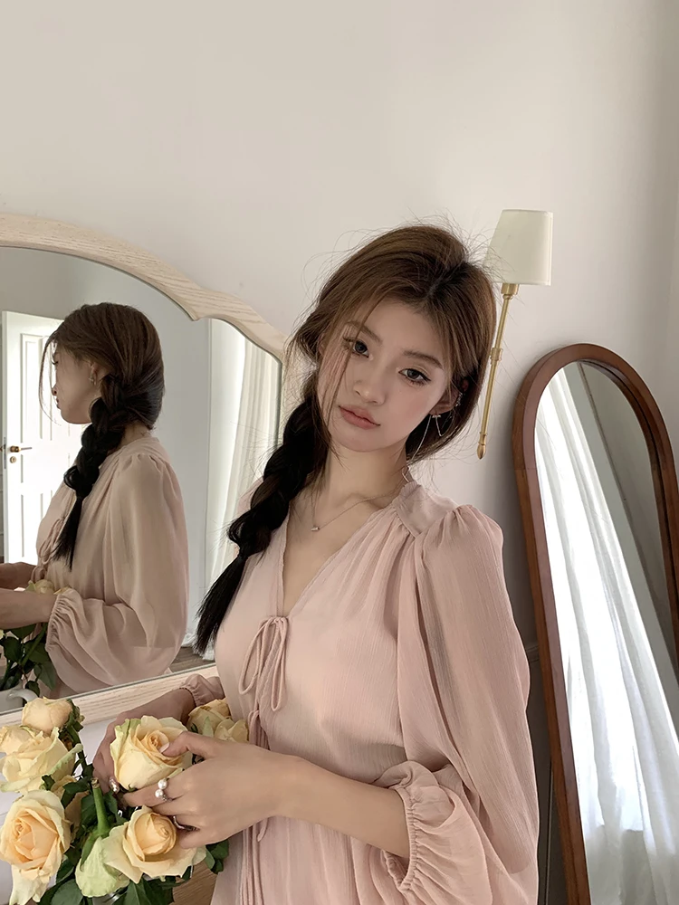 Bxoxo Women's Elegant Fairy Casual Korean Style Dresses New V-Neck Lace-up Long Lantern Sleeve Ruffles Midi Dress 2025 Holiday Vestido