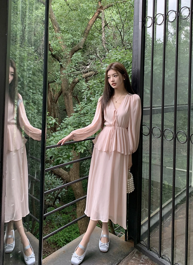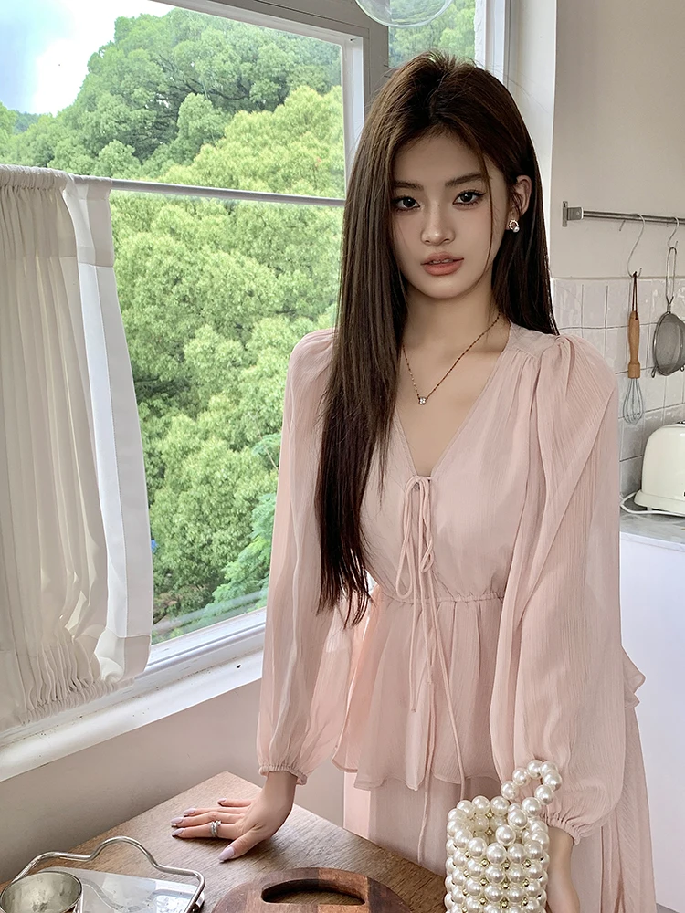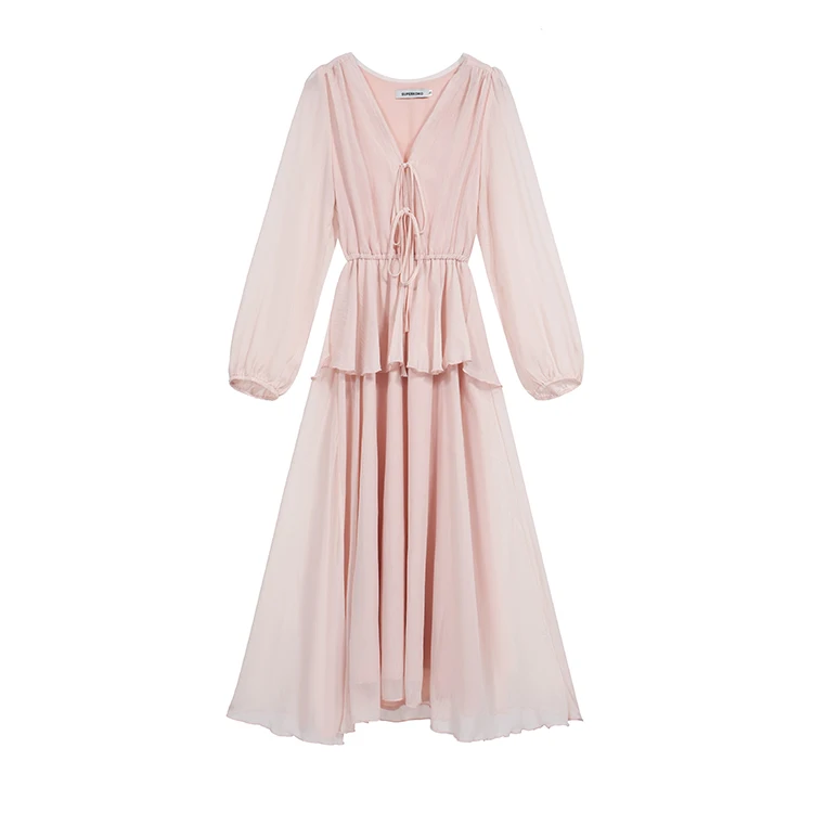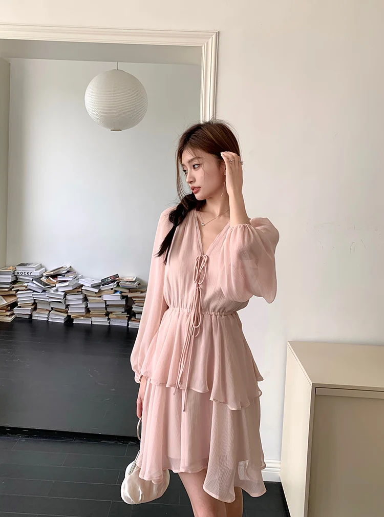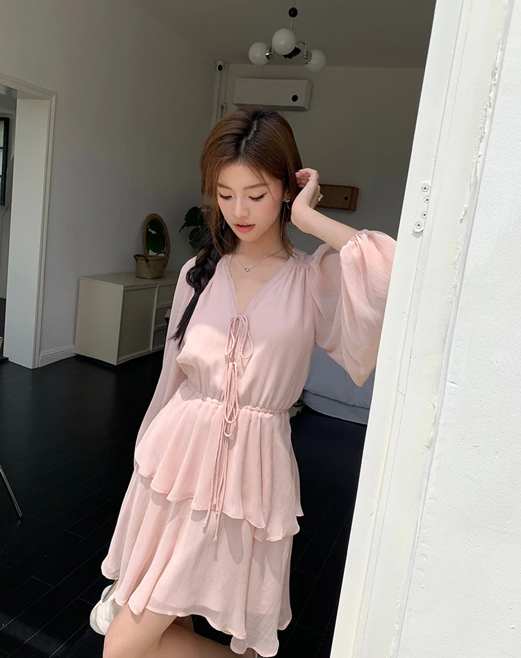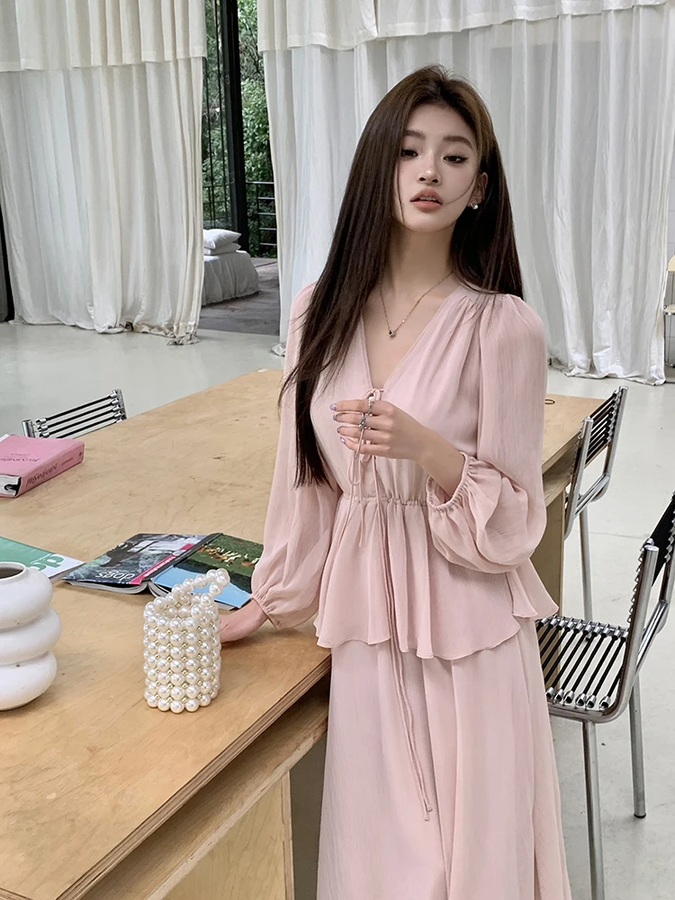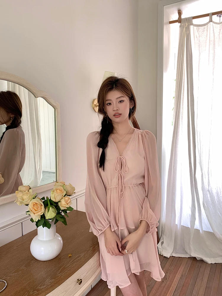 Bxoxo Women's Elegant Fairy Casual Korean Style Dresses New V-Neck Lace-up Long Lantern Sleeve Ruffles Midi Dress 2025 Holiday Vestido