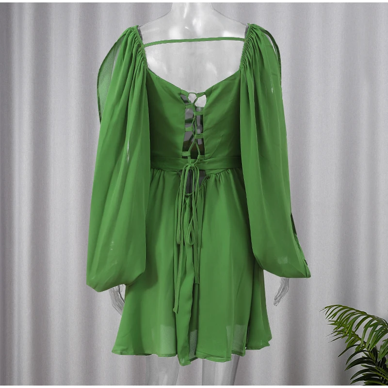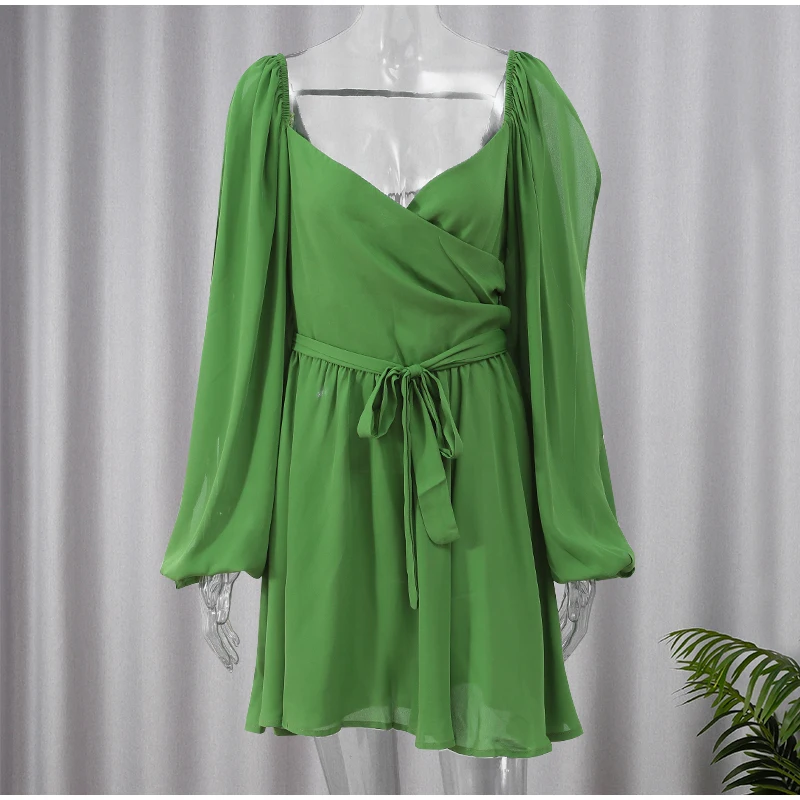 BXOXO Women's Fashion Green Chiffon Mini Dress Elegant V-neck Split Long Sleeve Ruffle High Waist Dresses Lady Holiday Beach Vestidos