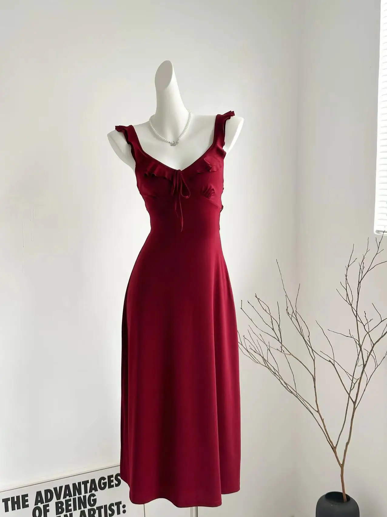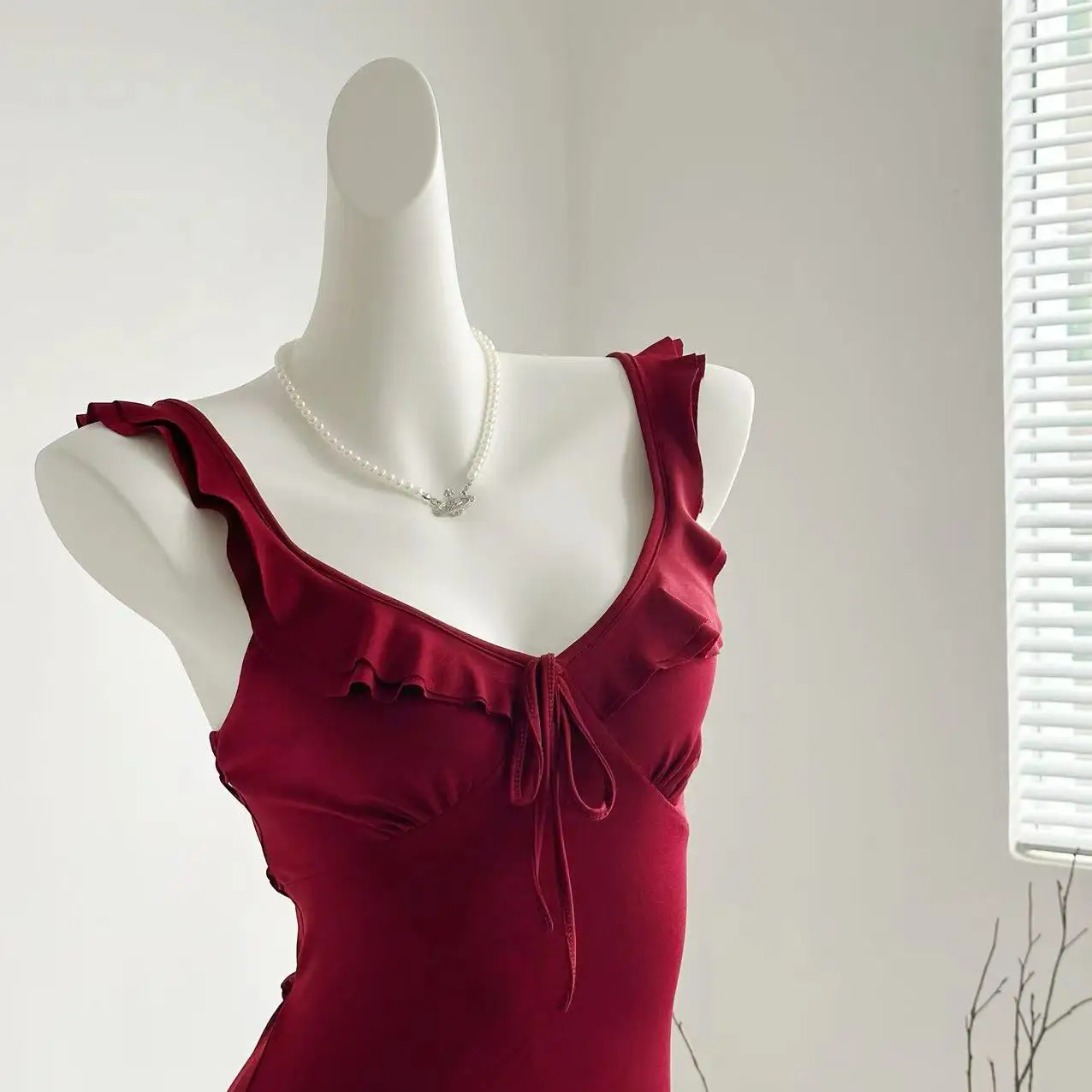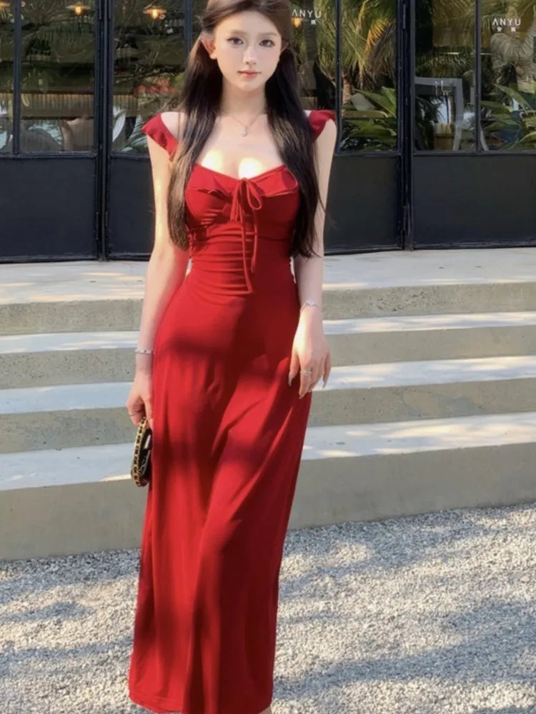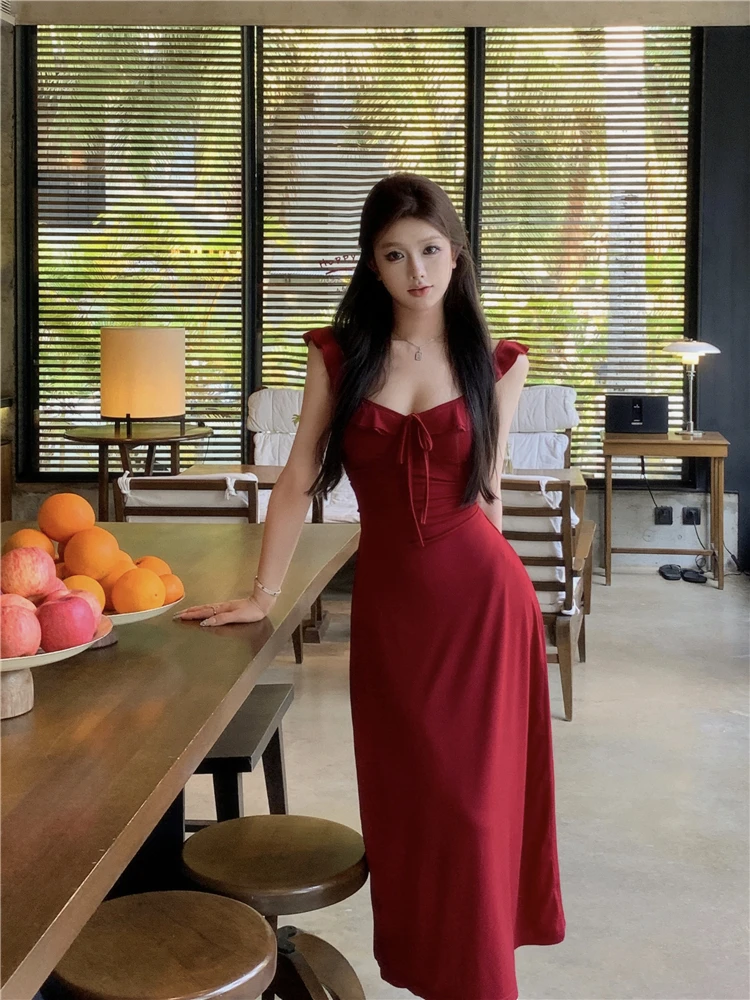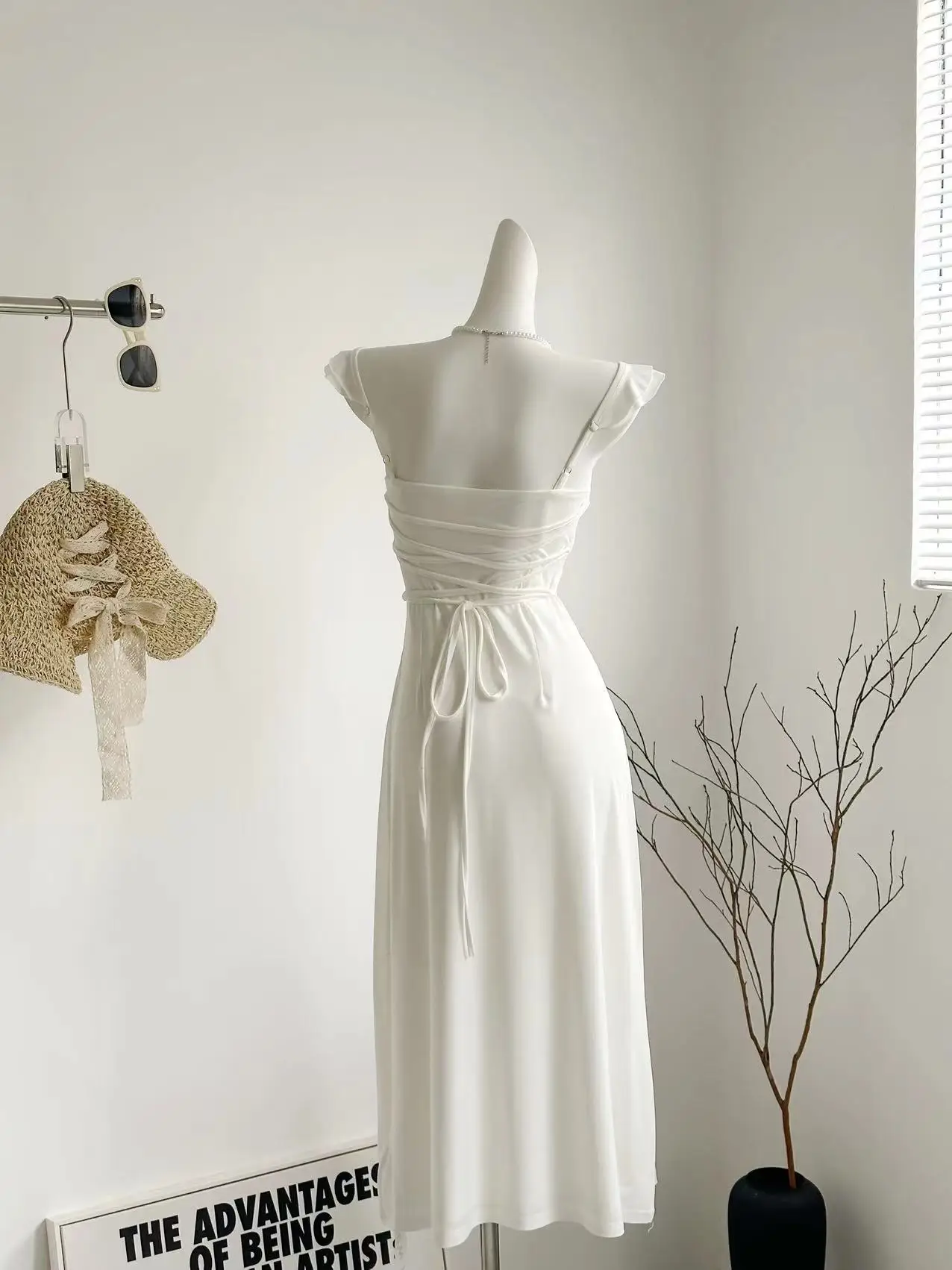 Bxoxo Women's Korean Elegant Ruffles V-neck Lace-up A-Line Dress Sexy Backless Slim Waist Flying Sleeves Dresses Basics Office Lady