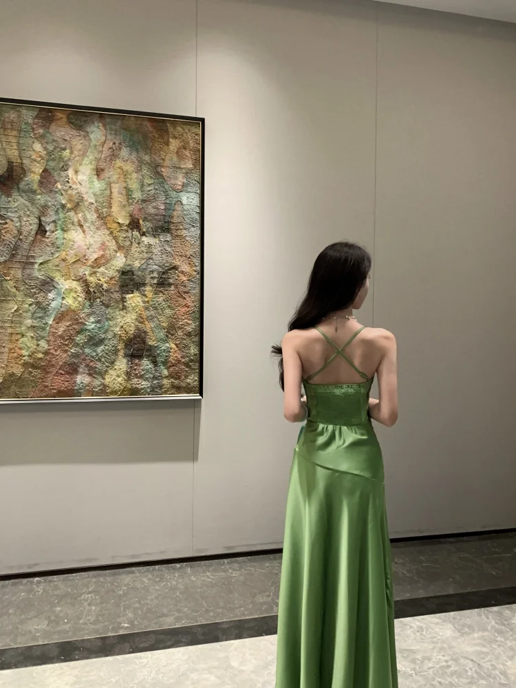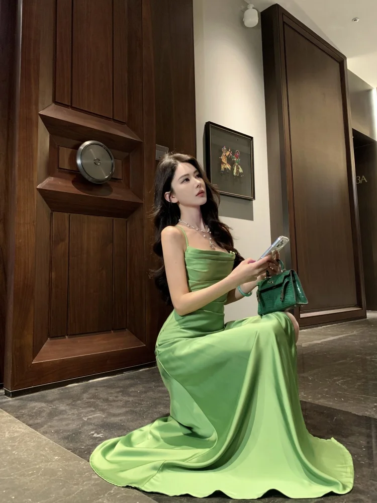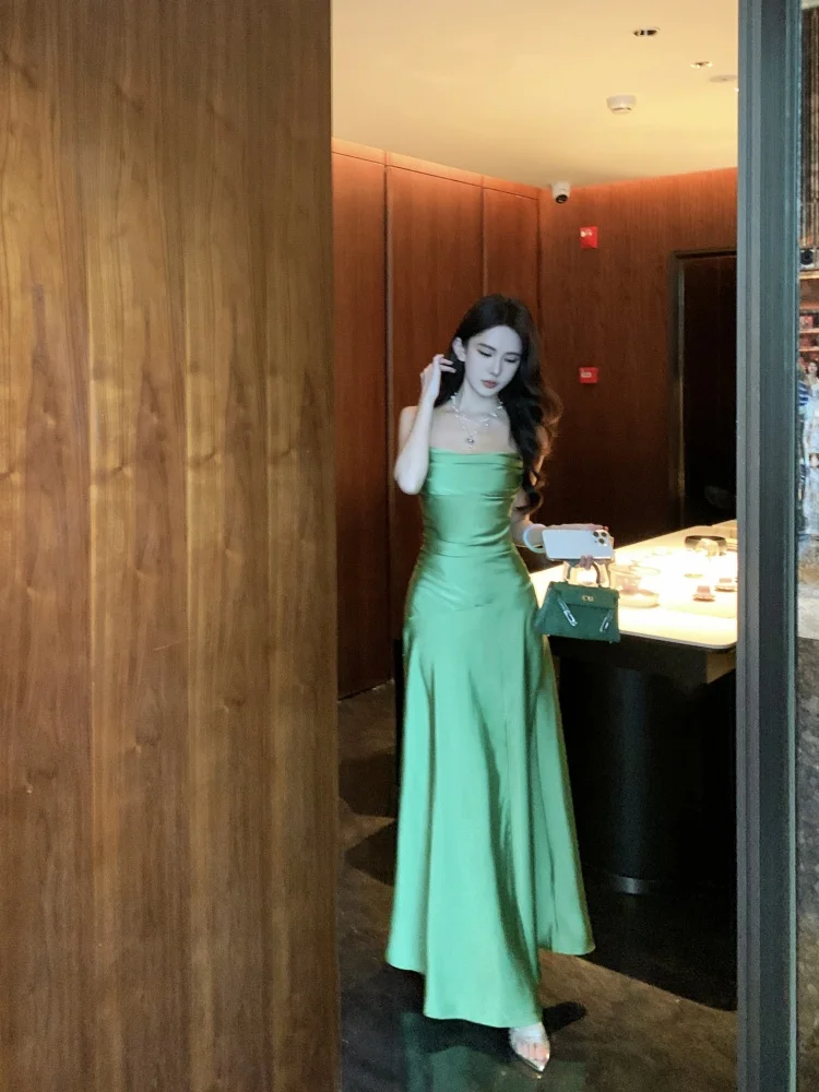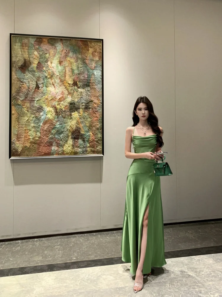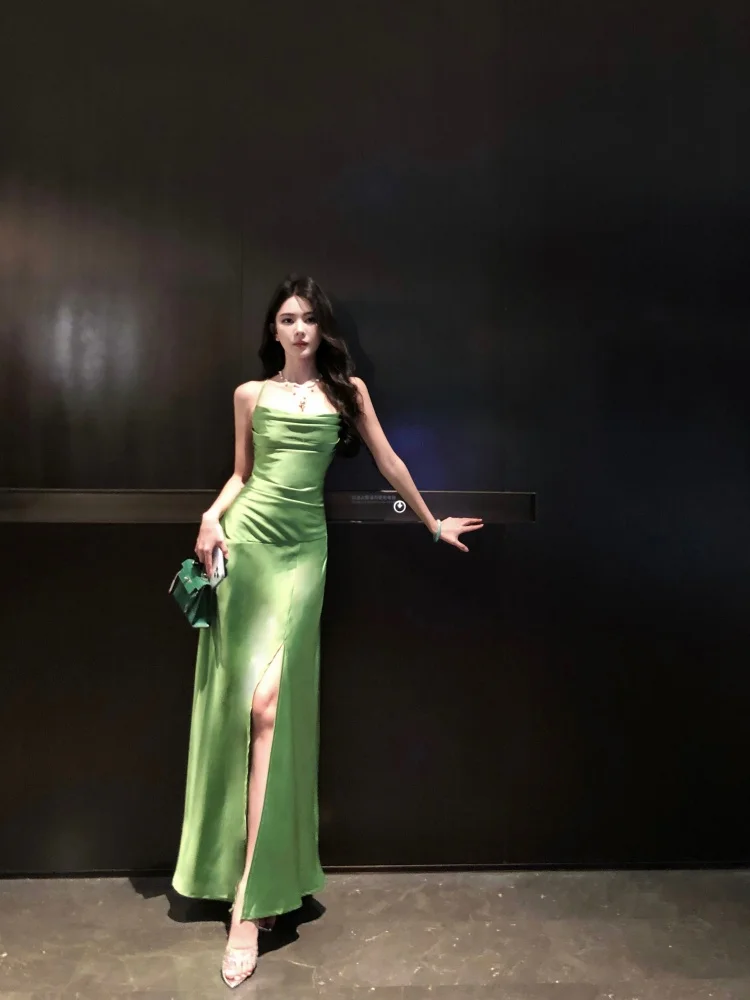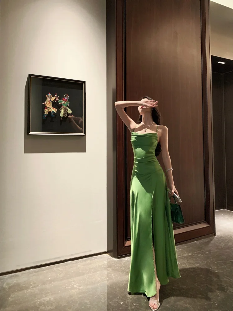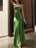 Bxoxo Women's Satin Green Evening Midi Dress Elegant Sleeveless Slit Party Holiday Dresses Slim A-line Wedding Guest Gown Vestidos New