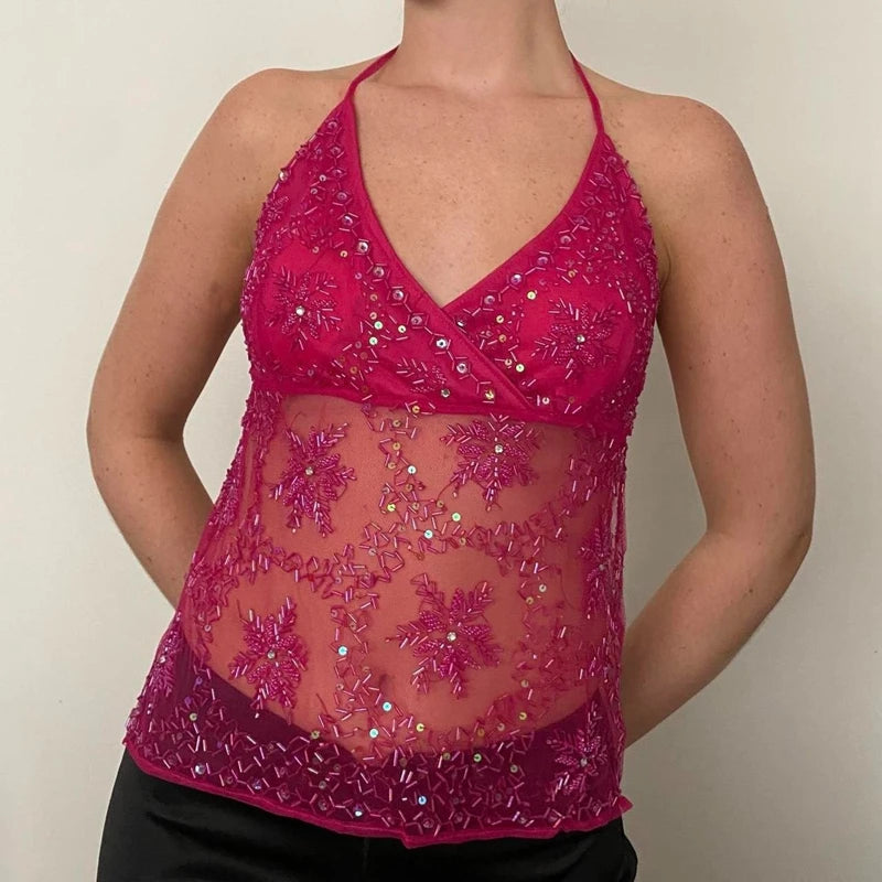 BXOXO Women's Sequin Halter Tank Tops Sleeveless V-Neck Backless Slim Fit Sheer Mesh Vest Y2k Sparkle Club Party Rave Outfit