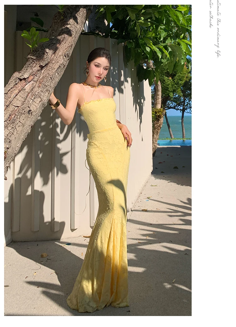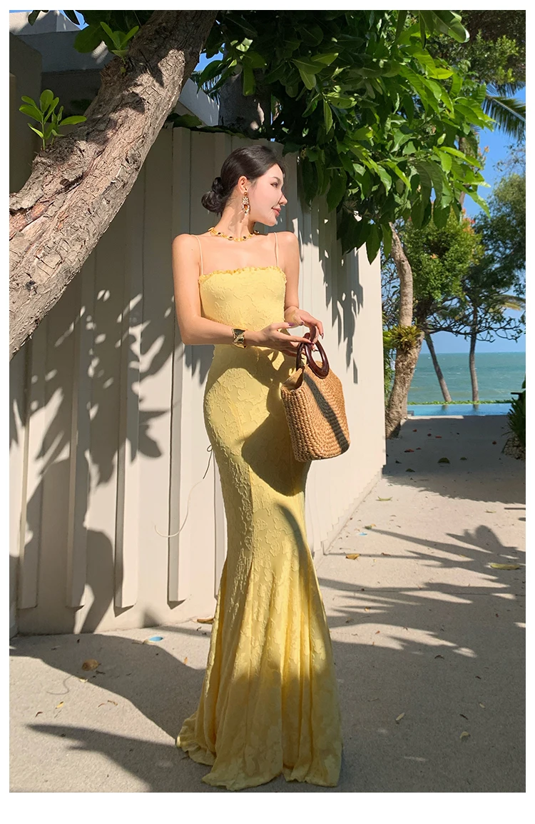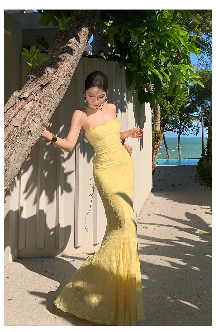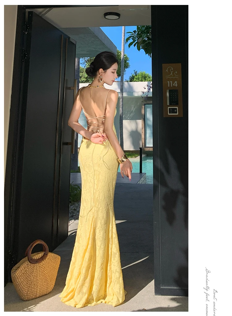 Bxoxo Women's Sexy Bodycon Party Dress Elegant Summer Yellow Lace-up Evening Spaghetti Strap Dresses 2025 New Chic Beach Holiday Robe